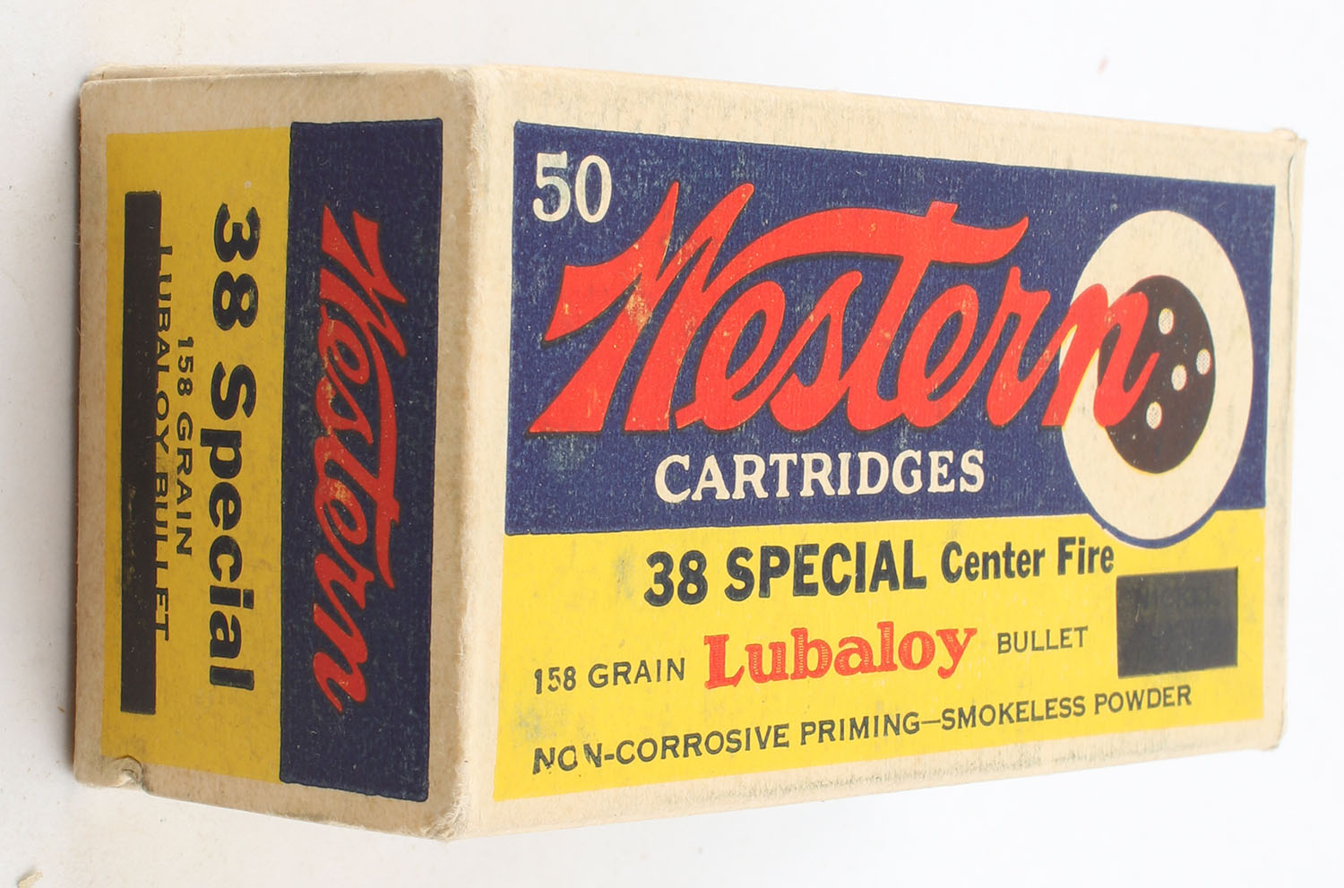 Western, Cartridges, .38 Special, 158 Grain Lubaloy Bullet, Full, 1pc. Yellow blue & red bulls eye box, box is very solid with excellent color, corners are sharp, edges are crisp, end flaps are solid, ammo is excellent. Grade: Excellent ++ - Value: 40 to 60