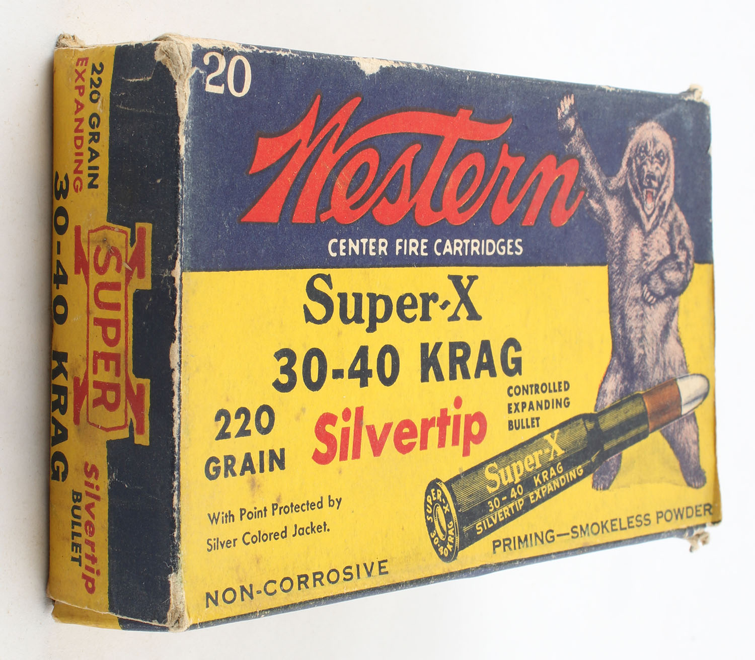 Western, Super-X Silvertip, .30-40 Krag, 220 Grain Controlled Expanding Bullet, Full, 1pc. Yellow blue & red bear box, box is solid with excellent color, has edge & corner wear, light scuffing, end flaps are solid, ammo is excellent. Grade: Excellent - Value: 80 to 140
