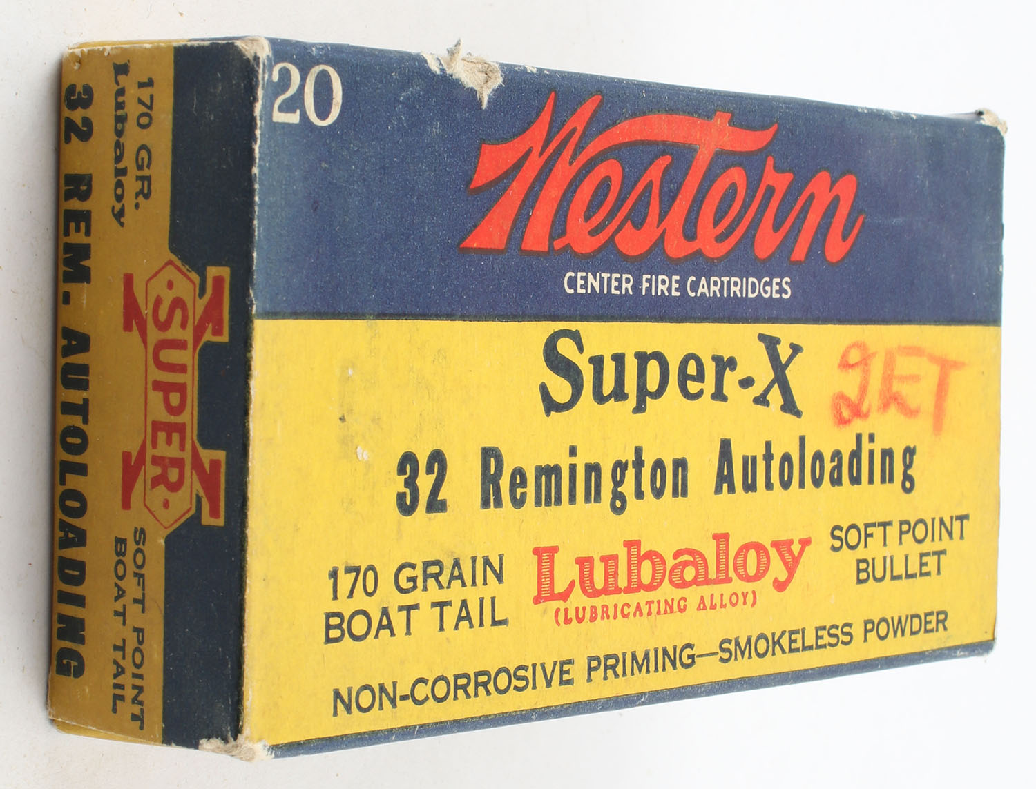 Western, Super-X, .32 Remington Autoloading, 170 Grain Boat Tail Lubaloy Soft Point Bullet, Full, 1pc. Yellow blue & red box, box is solid with excellent color, has light scuffing with edge & corner wear, end flaps are solid, ammo is excellent. Grade: Excellent - Value: 40 to 80