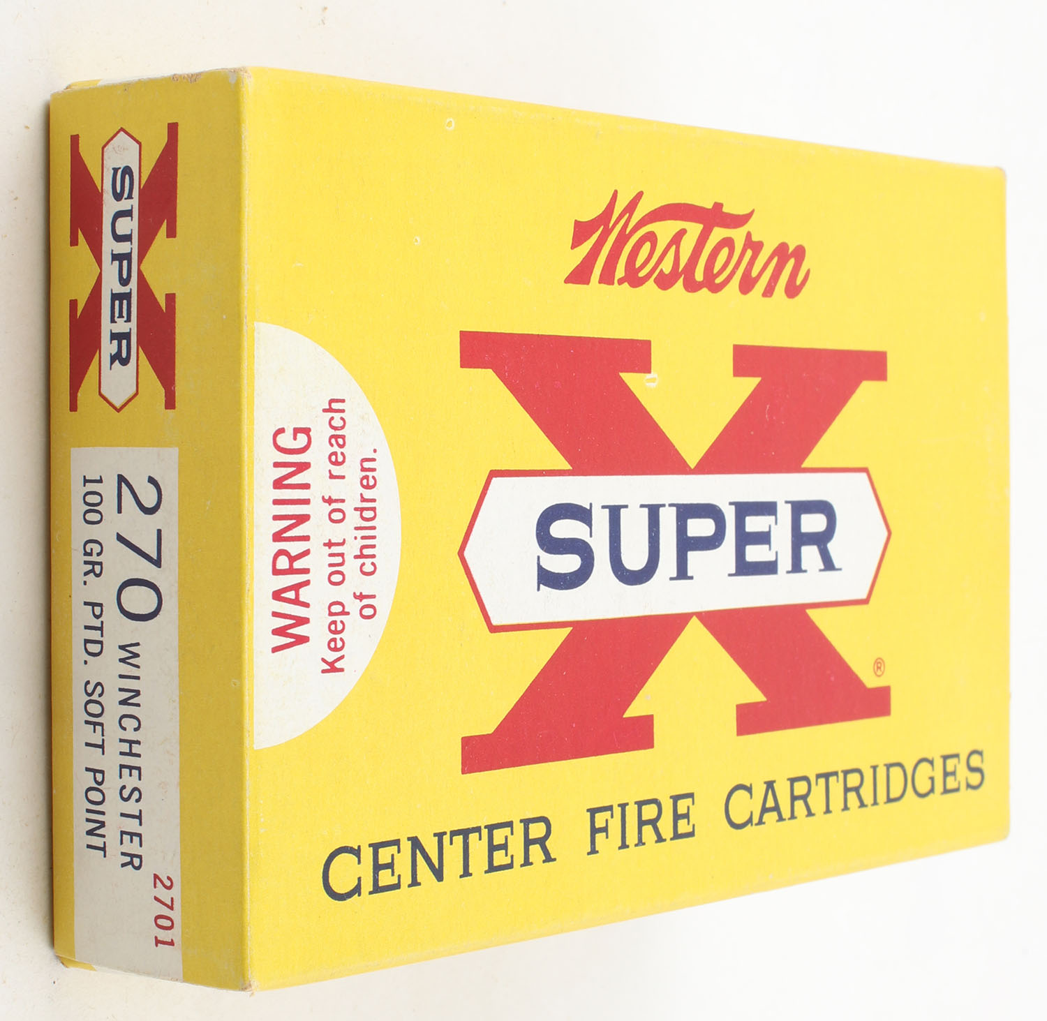 Western, Super X, .270 Winchester, 100 Grain Pointed SP., Full, 1pc. Center Fire Cartridges, Yellow red & white box, box is very solid with excellent color, end flaps are solid, ammo is excellent. Grade: Excellent ++ - Value: 20 to 60