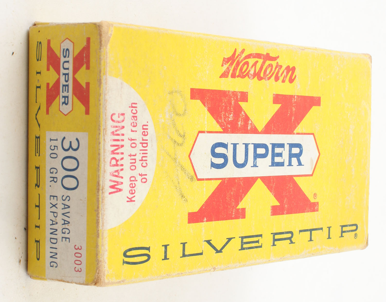 Western, Super X Silvertip, .300 Savage, 150 Grain Expanding Bullet, Full with 15rds. Being correct, 1pc. Yellow white & red box, box is solid with good color, box has scuffing, light edge & corner wear, end flaps are solid, ammo is excellent. Grade: Very Good ++ - Value: 20 to 60