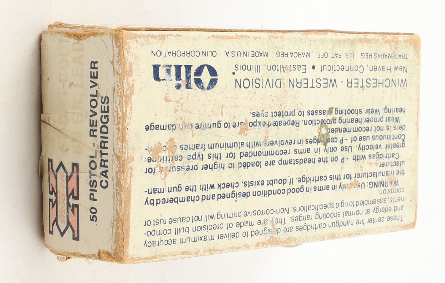 Western, X, .32 Short Colt, 60 Grain Lead Bullet, Appears Full, 1pc., White red & blue box, box has scuffing with age soiling, edge & corner wear, end flaps are solid, ammo is excellent. Grade: Good - Value: 20 to 60