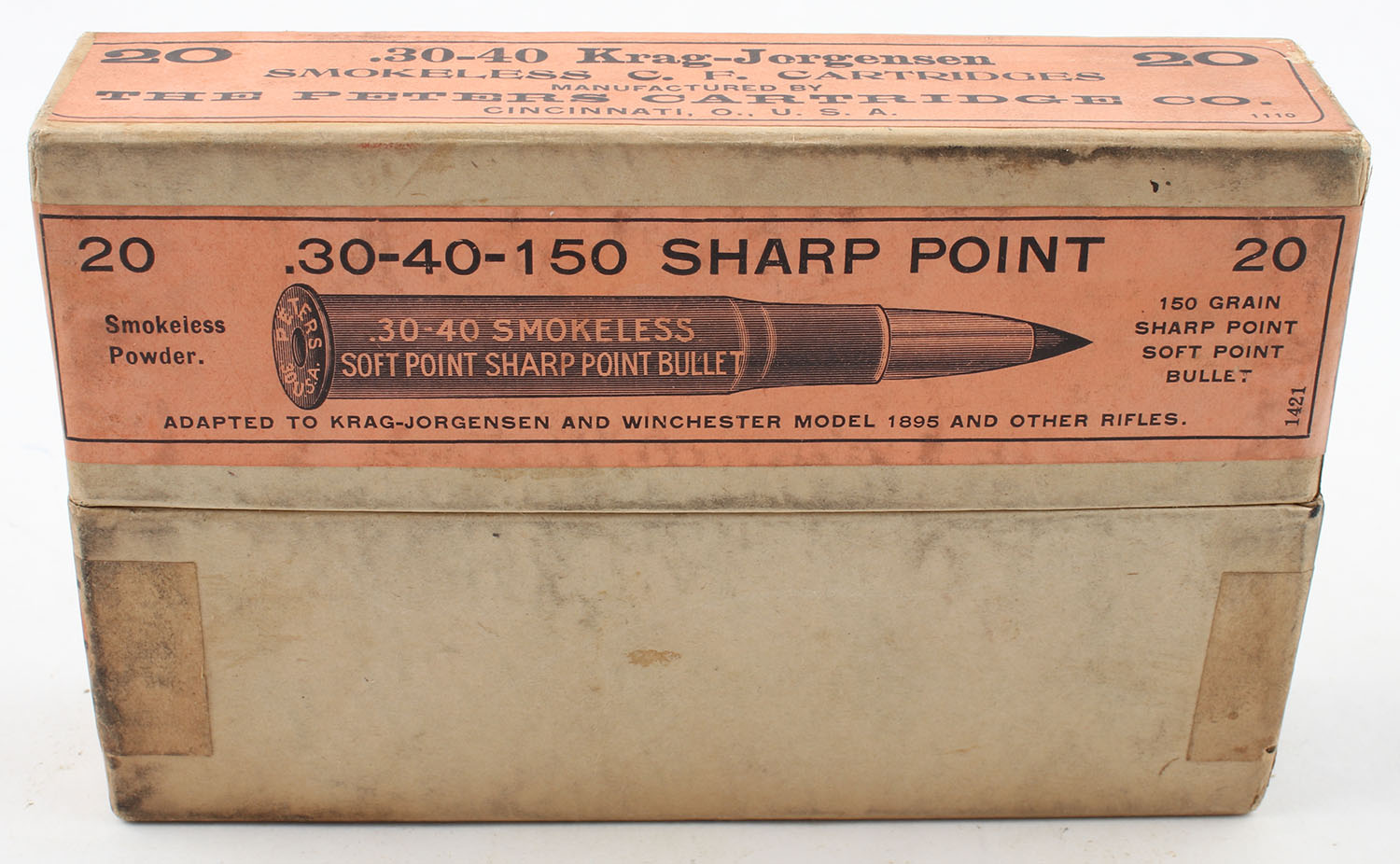 Peters, Center Fire Cartridges, .30-40 Krag-Jorgensen, 150 Grain Sharp Point SP Bullet, FULL & SEALED, 2pc. Buff box with salmon label & black print, box is very solid with excellent color to label, has scuffing with light age soiling, labels are intact. Grade: Excellent - Value: 30 to 100
