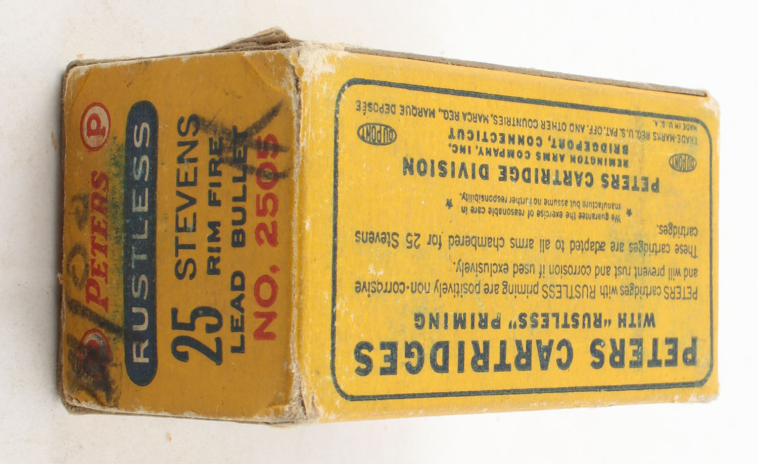 Peters, Rustless, .25 Stevens Rim Fire, Lead Bullet, Full with 1 ''U'' H/S, 1pc. Blue yellow & red box, box is solid with very good color, some age soiling & shelf wear, some corner wear, end flaps are solid, ammo is excellent. Grade: Very Good ++ - Value: 40 to 120