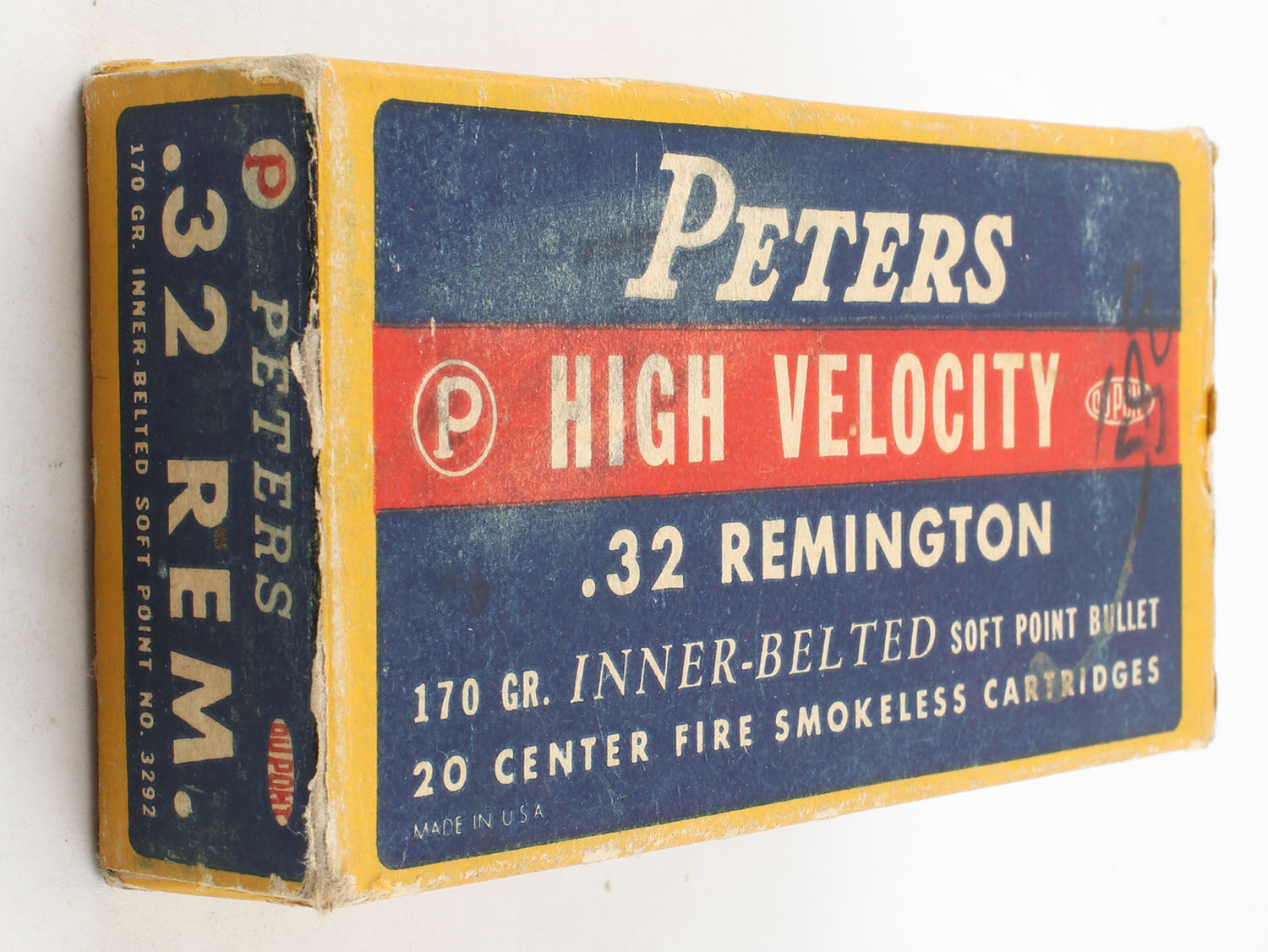 Peters, High Velocity, .32 Remington, 170 Grain Inner-Belted Soft Point Bullets, Full, 1pc. Yellow blue & red box, box is solid with very good color, has light scuffing, edge & corner wear, end flaps are solid, ammo is excellent. Grade: Excellent - Value: 40 to 60