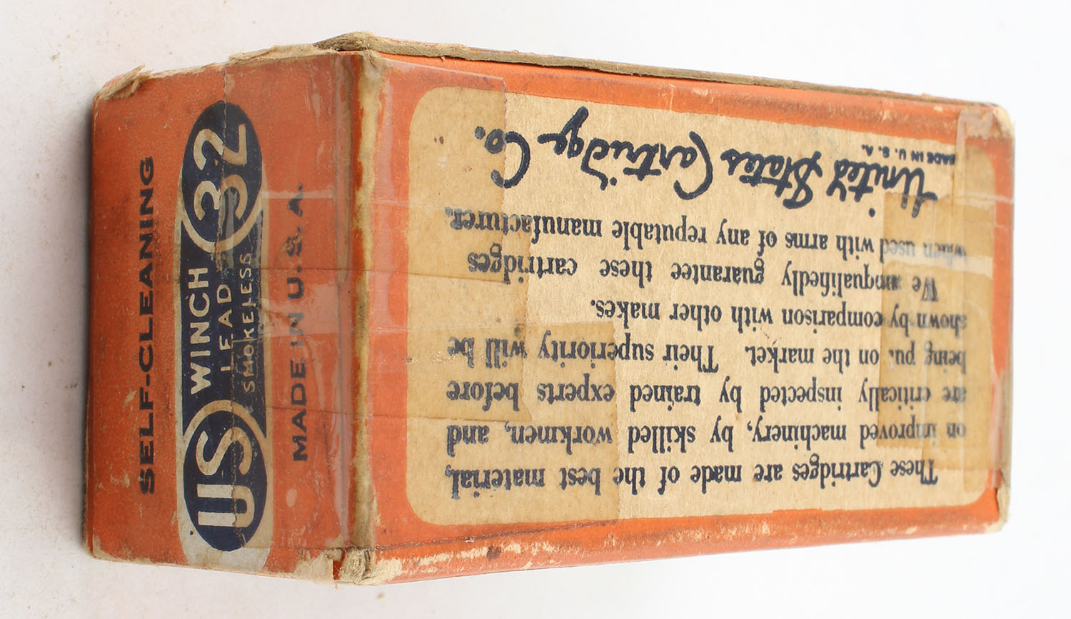 U.S. Cartridge Co., .32 Winchester, Self-Cleaning, Central Fire Smokeless, Full, 1pc. Orange & blue box, box has light age soiling, edge & corner wear, end flaps have tape repairs, ammo is excellent. Grade: Very Good - Value: 20 to 40