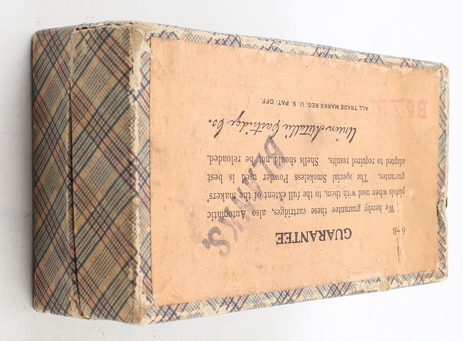 UMC, Black Powder Blanks, .45 Smith & Wesson, Half-Charge, Full, 2pc. Purple fabric box with blue top label, ''Half-Charge'' over-stamp, box is solid with very good color, minor age soiling, corners are mostly sharp, minor edge wear, label is intact, ammo is very good. Grade: Excellent - Value: 20 to 80