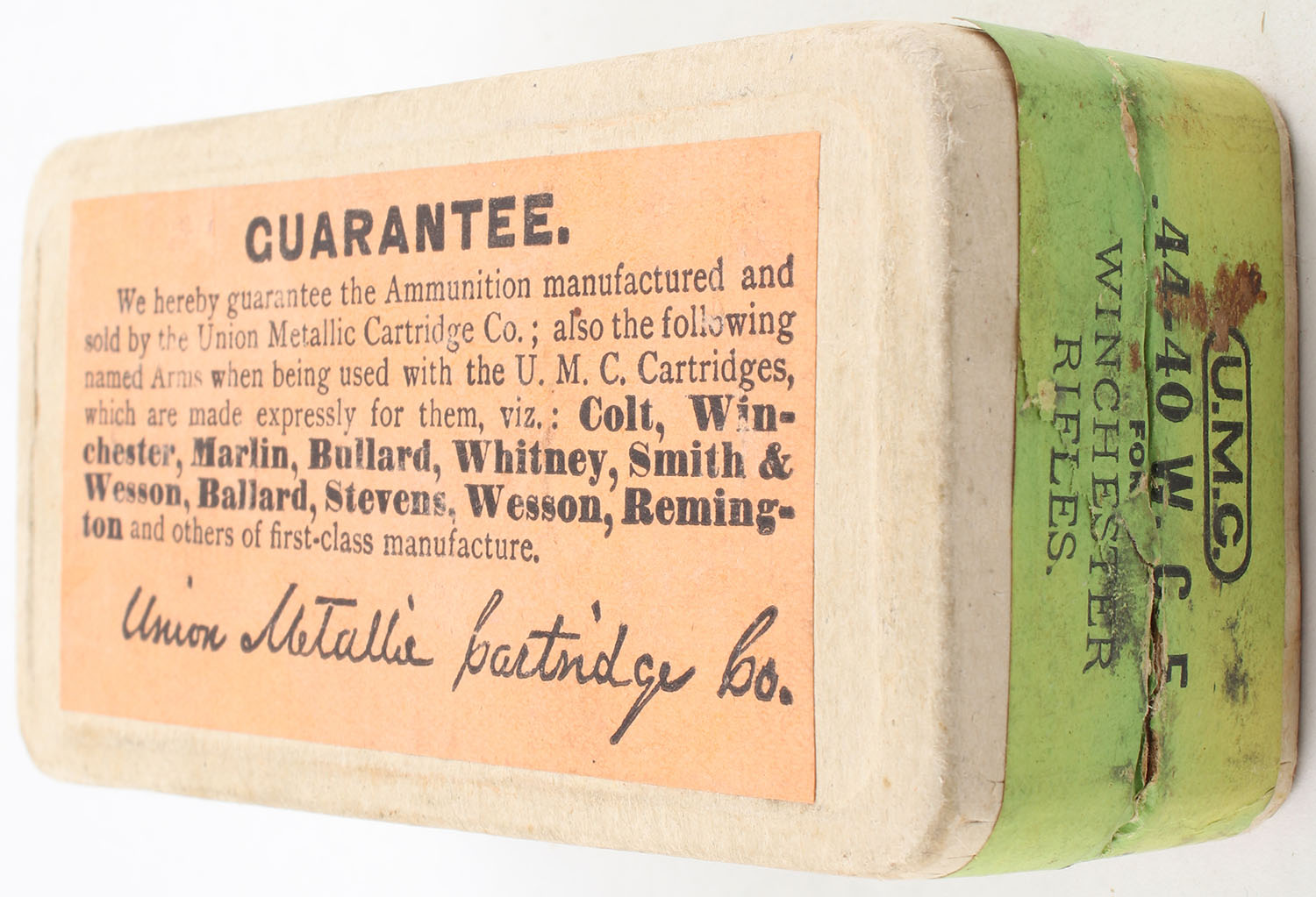 U.M.C., Central-Fire Cartridges, .44 Winchester, 40 Grains Powder, 217 Grain Bullet, Full, 2pc. Buff box with green top & side sealing labels, box is solid with very good color, has light age soiling, minor edge wear, labels are intact, ammo is very good. Grade: Very Good ++ - Value: 100 to 200