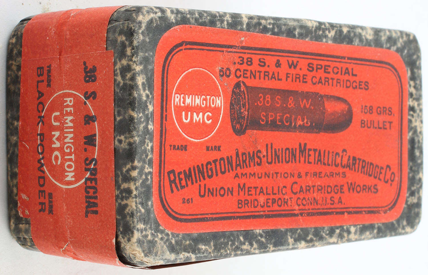 REM-UMC, Central Fire Cartridges, .38 Smith & Wesson Special, 158 Grs. Bullet, FULL & SEALED, 2pc. Black mottled box with red top & side sealing labels, box is very solid with excellent color, very minor corner wear, edges are crisp, labels are intact. Grade: Excellent ++ - Value: 50 to 200