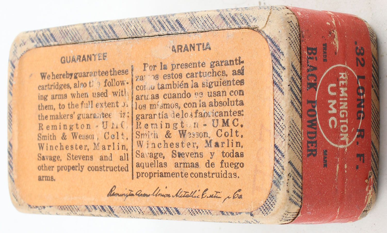 REM-UMC, .32 Long Rim Fire, 90 Grain, FULL & SEALED, 2pc. Purple fabric box with pink top & red side sealing labels, box is very solid with excellent color, minor age soiling, light edge & corner wear, labels are intact. Grade: Excellent + - Value: 100 to 400