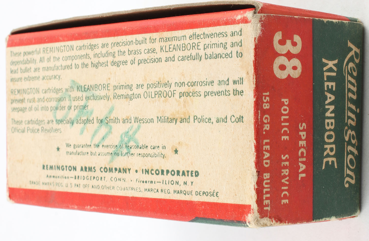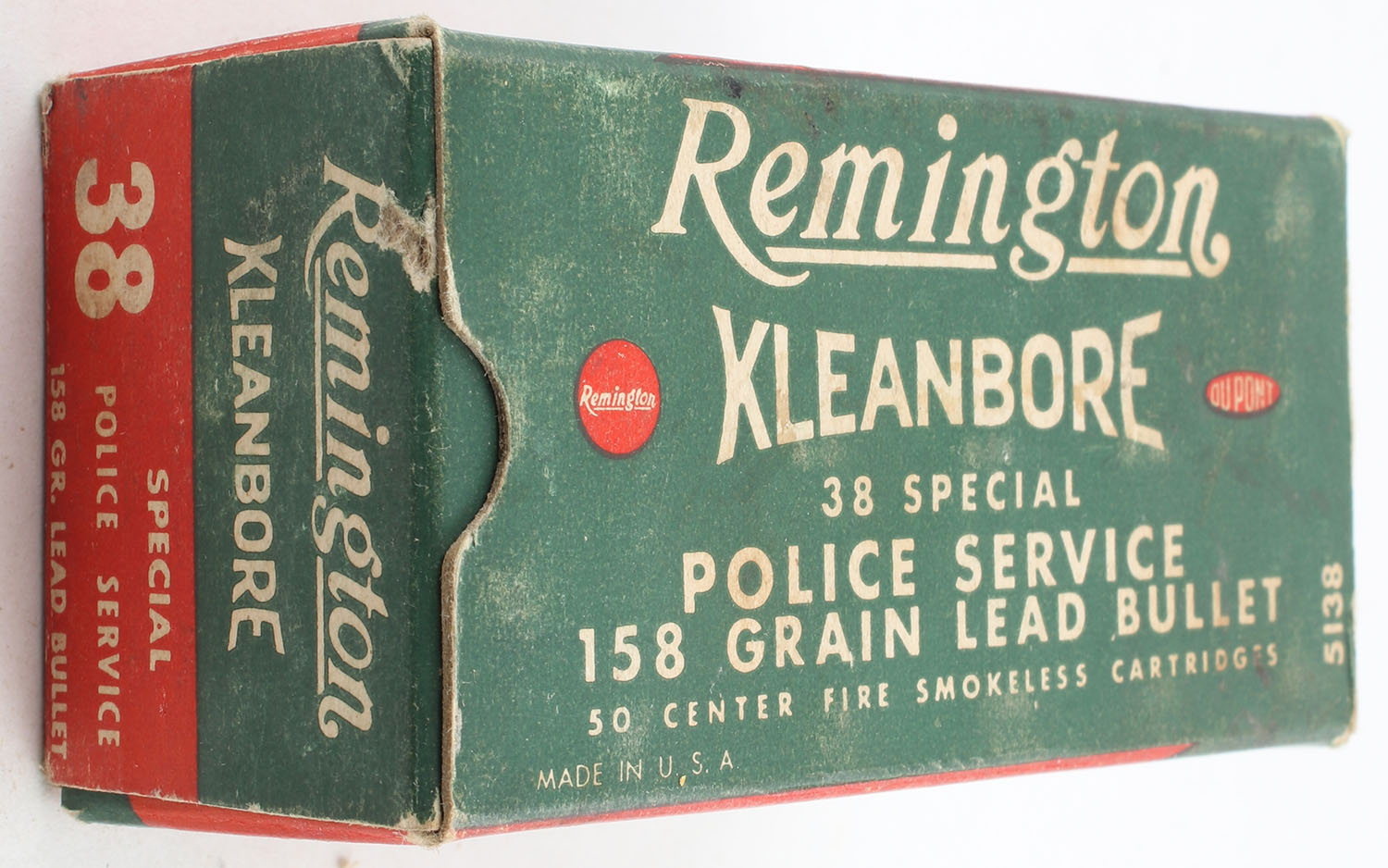 Remington, Kleanbore Police Service, .38 Special, 158 Grain Lead Bullet, Full, 1pc. Green buff & red box, box is solid with very good color, some color fading, very minor corner wear, edges are mostly crisp, end flaps are solid, ammo is excellent. Grade: Excellent - Value: 20 to 30