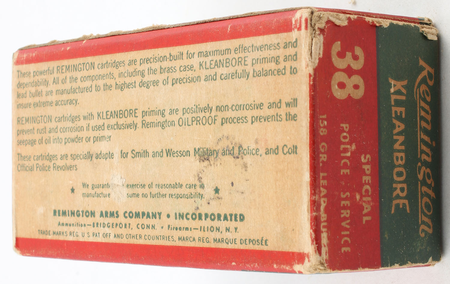 Remington, Kleanbore Police Service, .38 Special, 158 Grain Lead Bullet, Full, 1pc. Green buff & red box, box is solid with very good color, some color fading & scuffing, edge & corner wear, end flaps are solid, ammo is excellent. Grade: Very Good ++ - Value: 20 to 30