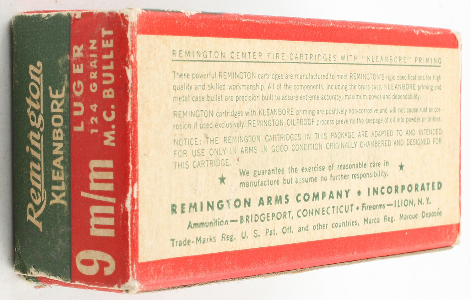 Remington, Kleanbore, 9mm Luger, 124 Gr. Metal Case Bullet, Full, 1pc. Green red & white box, box is solid with very good color, has light scuffing, light edge & corner wear, end flaps are solid, ammo is excellent. Grade: Very Good ++ - Value: 10 to 40
