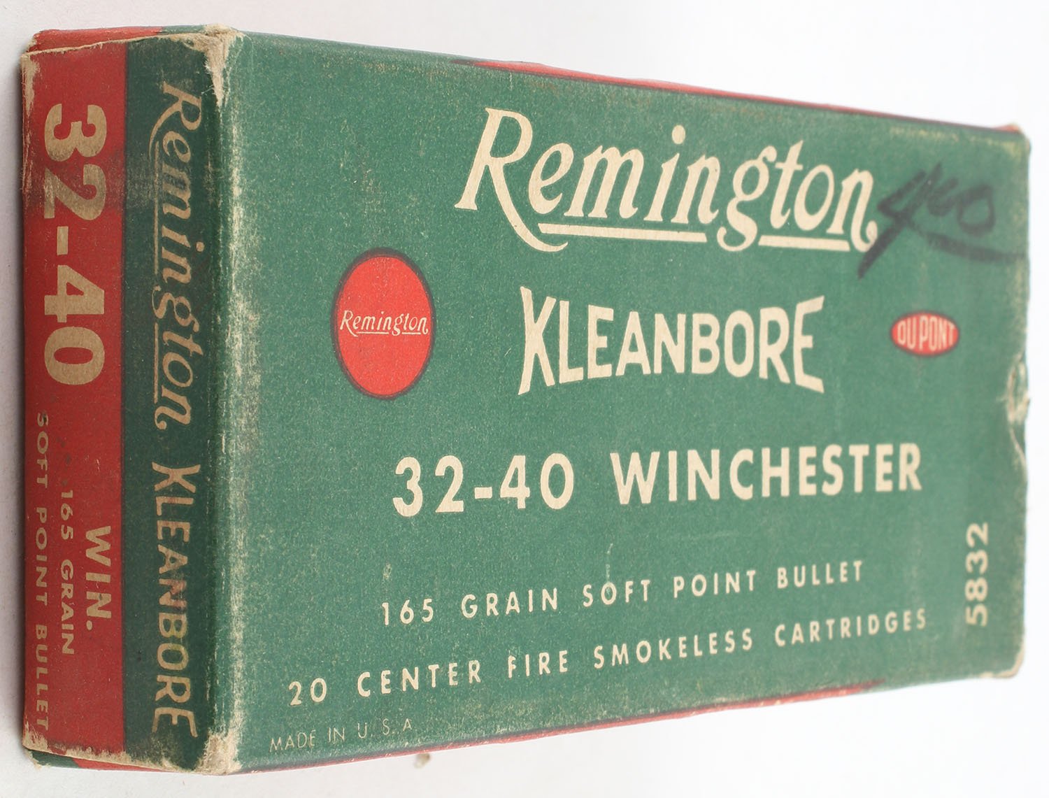 Remington, Kleanbore, .32-40 Winchester, 165 Grain Soft Point Bullet, Partial 19rds. 1pc. Green buff & red box, box is solid with good color, has light edge & corner wear, scuffing, end flaps are solid, ammo is excellent. Grade: Very Good ++ - Value: 60 to 90