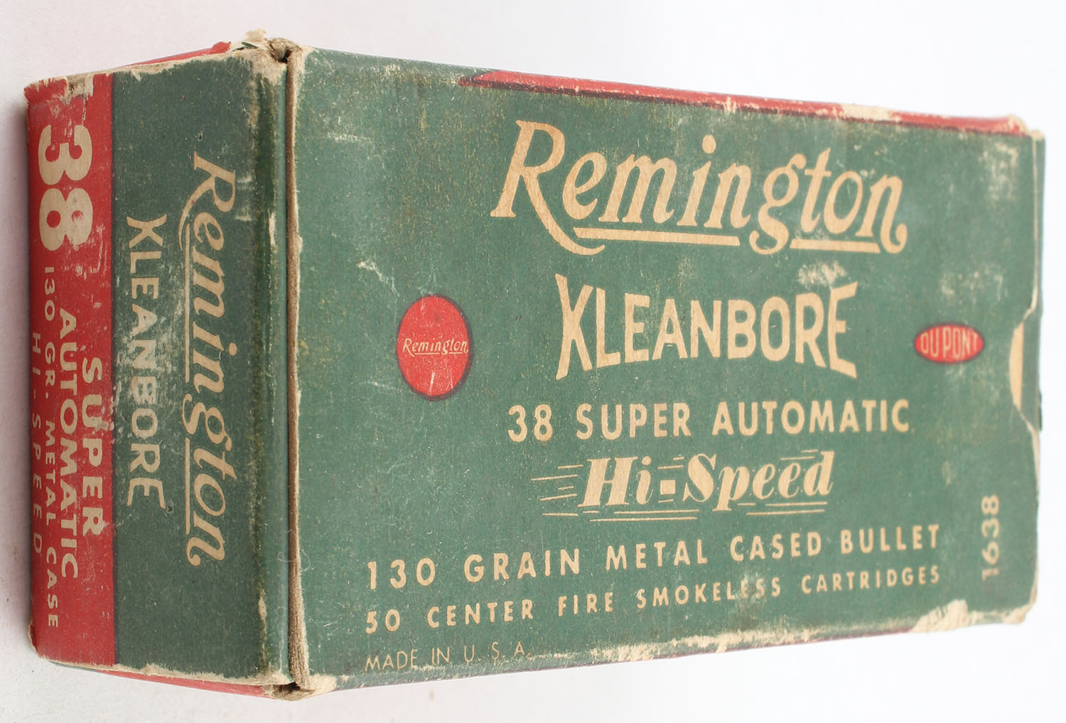 Remington, Kleanbore, .38 Super Automatic, 130 Grain Metal Case Bullet, Hi-Speed, Full, 1pc. Green white & red box, box is solid, has edge & corner wear, light scuffing, right end flap is torn, left flap is solid, ammo is excellent. Grade: Very Good - Value: 20 to 60