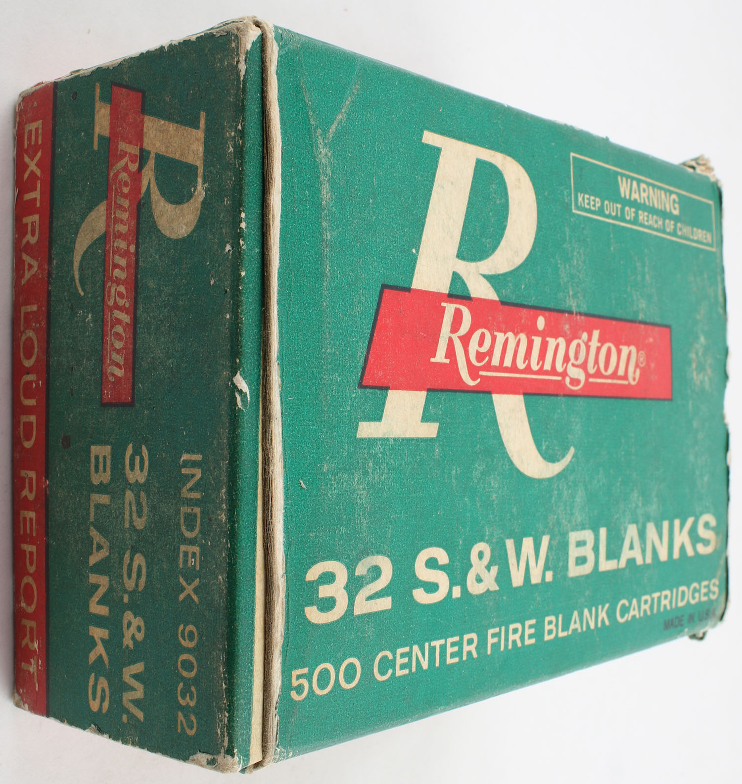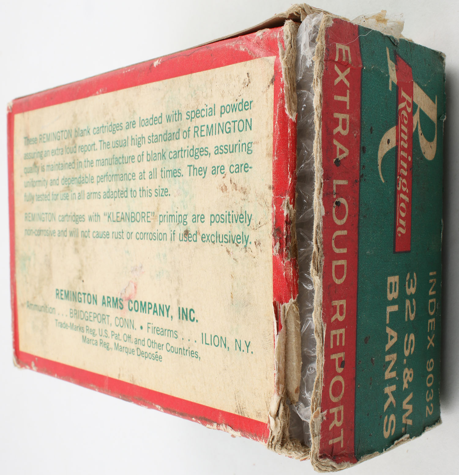 Remington, .32 Smith & Wesson Blanks, Extra Loud Report, Partial Case 8 Boxes (400rds.), 1pc. Green red & white case, case has torn right end flap, left end flap is solid, has edge & corner wear, scuffing, inside boxes are very solid with excellent color, ammo is excellent. Grade: Very Good ++ - Value: 50 to 75