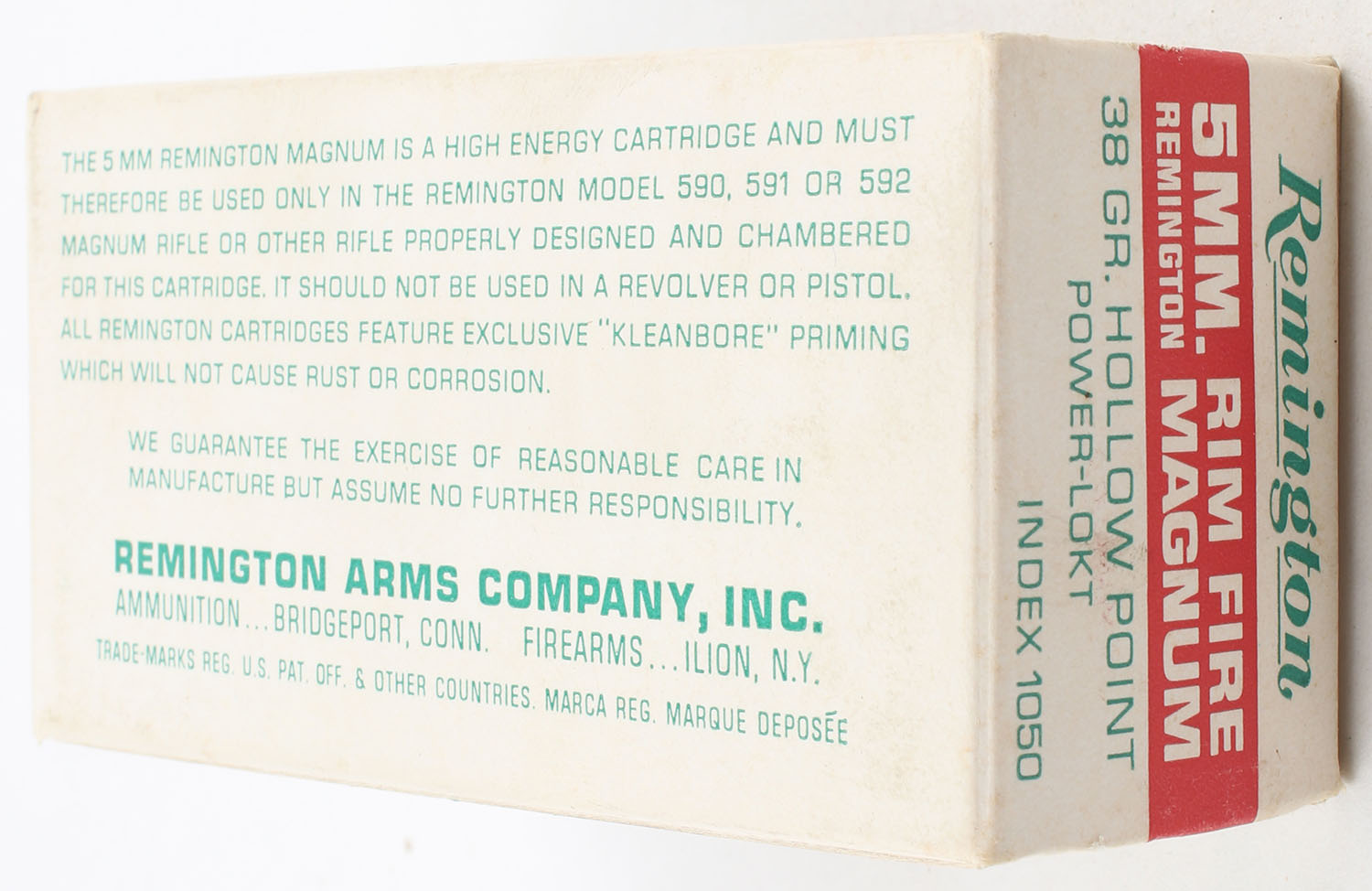 Remington, Hi-Speed, 5mm Remington Rim Fire Magnum, 38 Grain Hollow Point Power-Lokt, Full, 1pc. White red & green box, box is very solid with excellent colors, minor shelf wear, end flaps are solid, ammo is excellent. Grade: Excellent - Value: 40 to 100