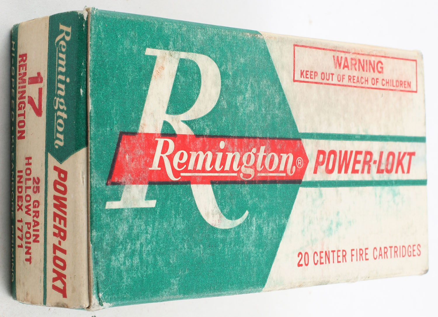 Remington, Power-Lokt, .17 Remington, 25 Grain Hollow Point, Full, 1pc. White green & red box, box is solid with very good color, has light scuffing, minor edge & corner wear, end flaps are solid, ammo is excellent. Grade: Very Good ++ - Value: 30 to 60