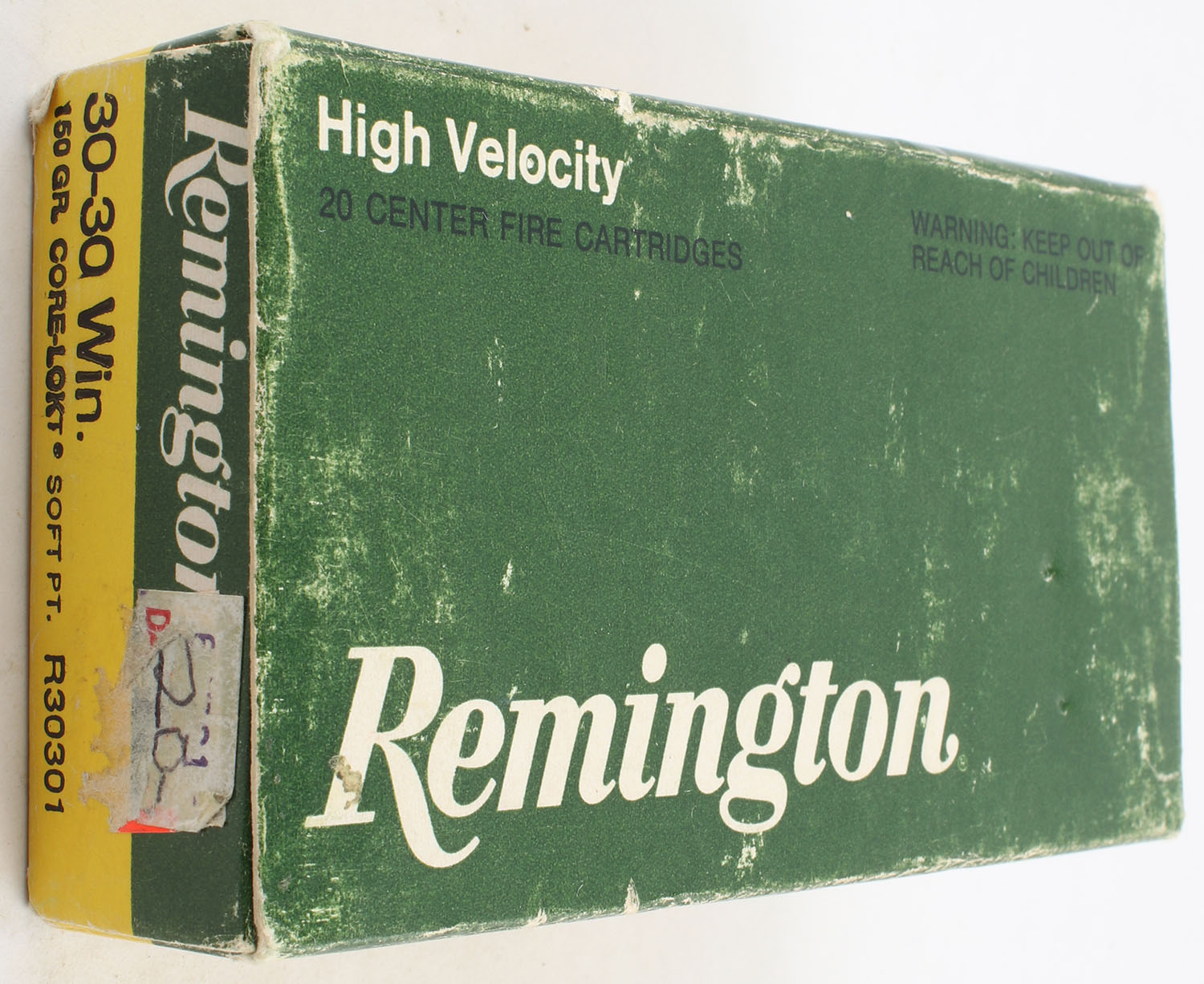 Remington, High Velocity, .30-30 Winchester, 150 Grain Soft Point Core Lokt, Full, 1pc. Green & yellow box, box is solid with good color, has scuffing, edge & corner wear, end flaps are solid, ammo is excellent. Grade: Very Good - Value: 20 to 40
