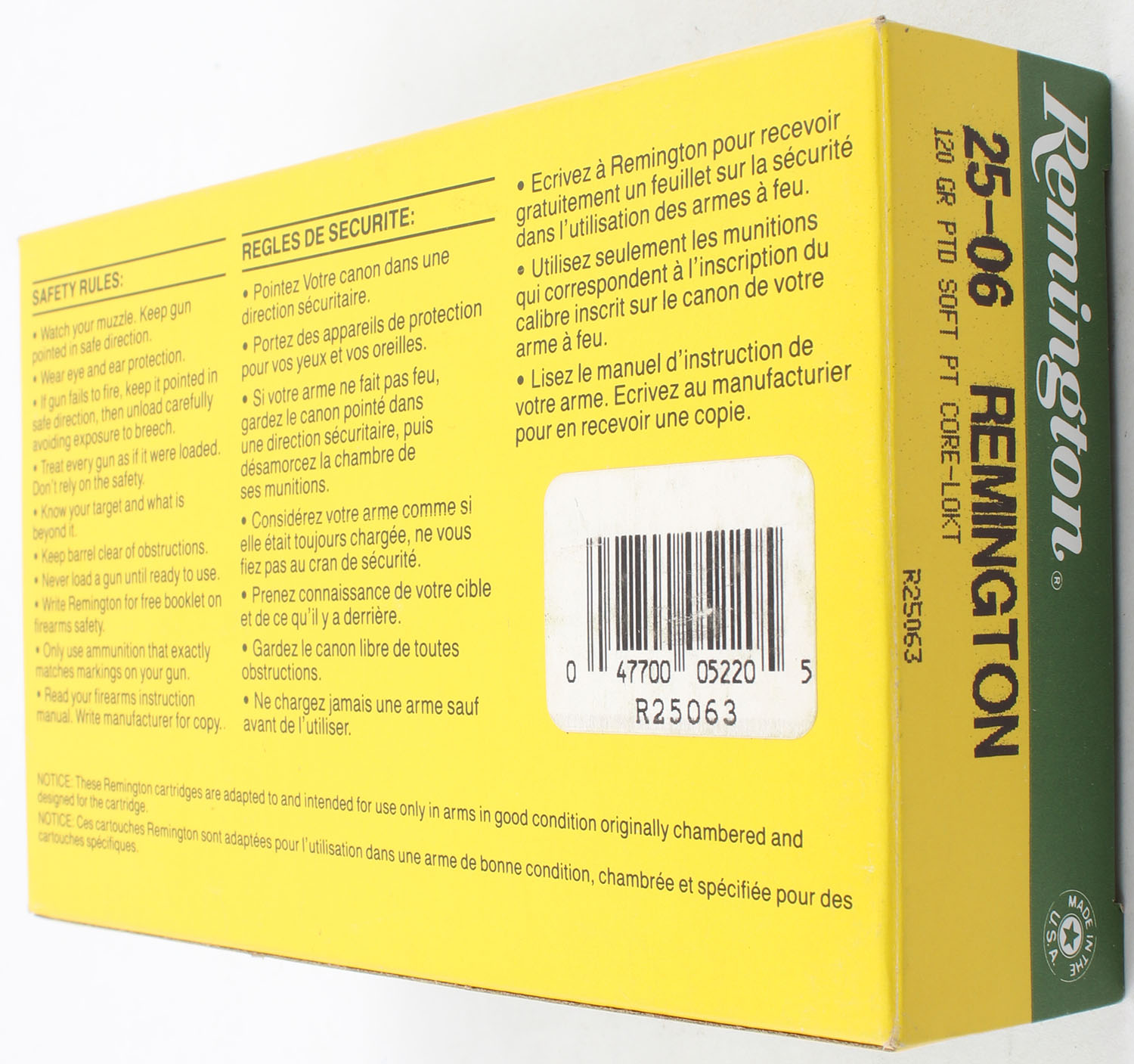 Remington, High Velocity, .25-06 Remington, 120 Grain PTD Soft Point Core Lokt, Full, 1pc. Green & yellow box, box is very solid with excellent color, end flaps are solid, ammo is excellent. Grade: Excellent ++ - Value: 40 to 60