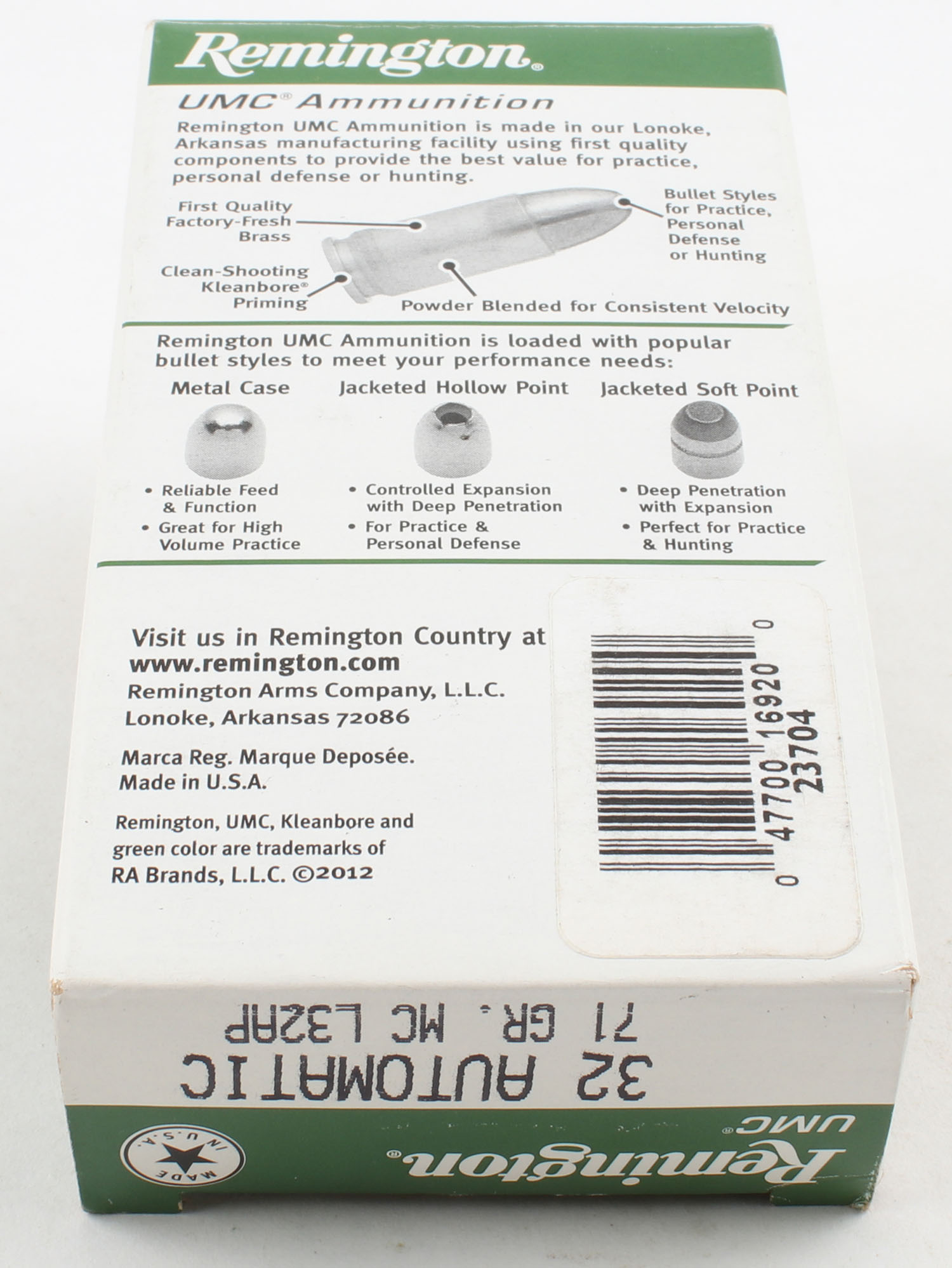 | Remington, UMC, .32 Auto., 71 Grain MC, Full, 1pc. Green white ...