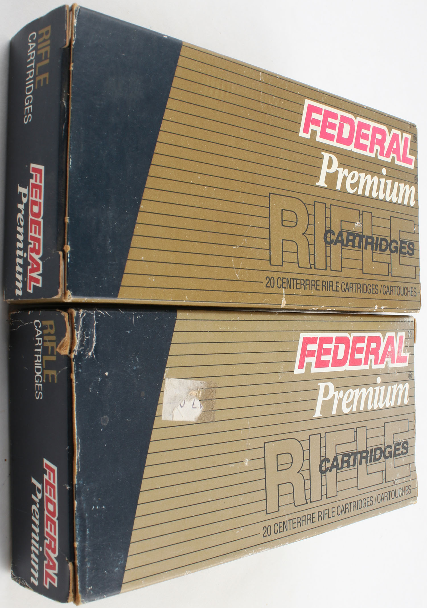 Federal, Lot of (2), Premium, 7-30 Waters, 120 Grain Boat Tail Soft Point, Full, 1pc. Multi-colored boxes, boxes are solid with light scuffing, ammo is excellent. Grade: Excellent - Value: 40 to 80