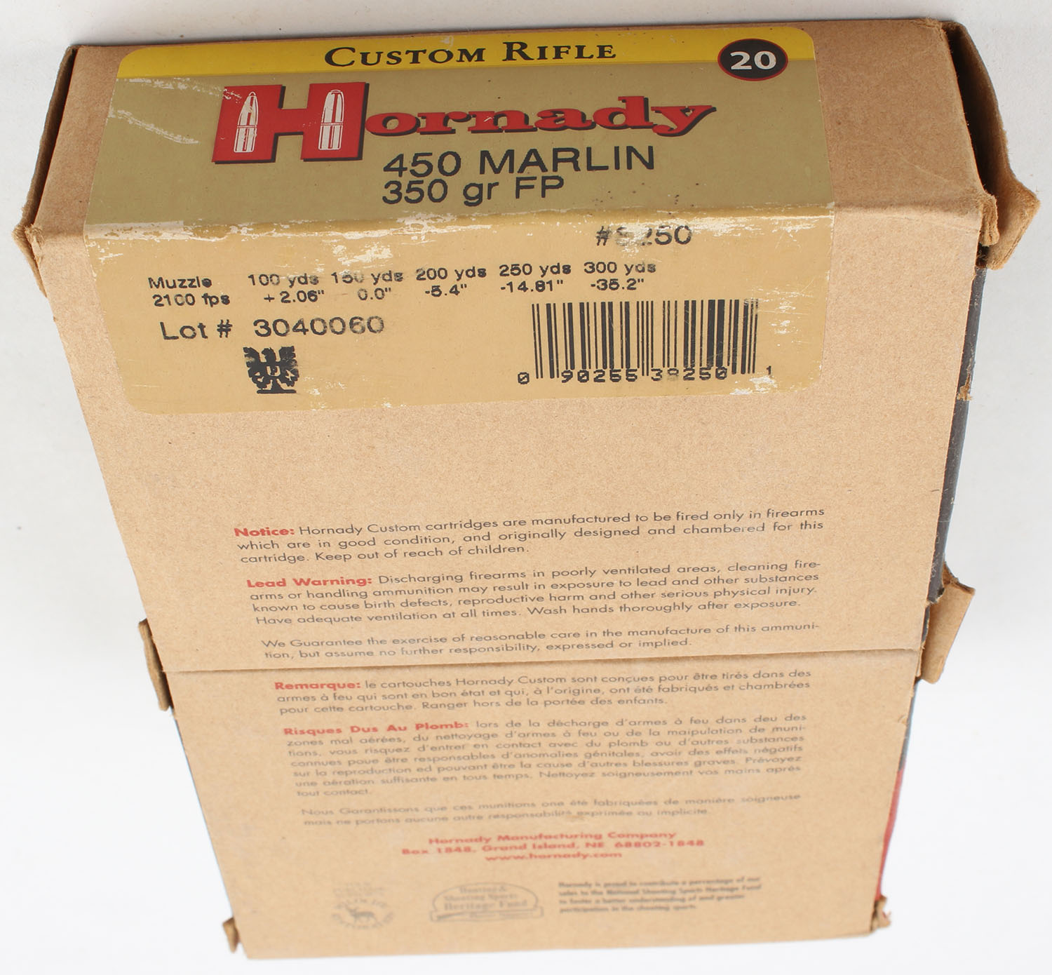 Hornady, Custom, 450 Marlin, 350 Grain FP, Full, 1pc. multi-colored box, box is very solid with excellent color, Ammo is excellent. Grade: Excellent + - Value: 50 to 150