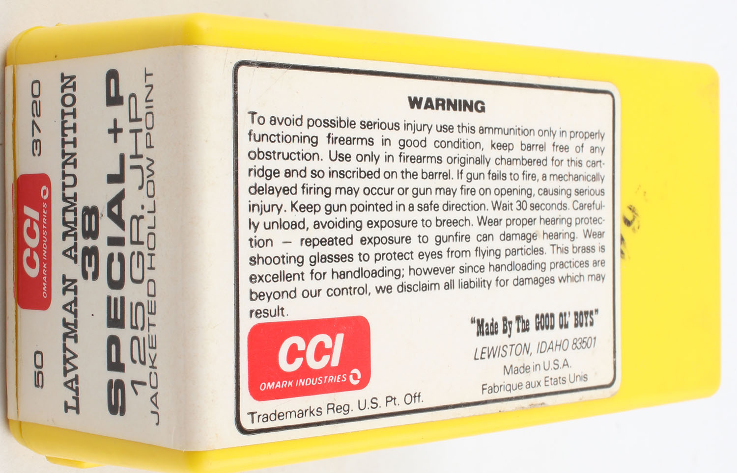 CCI, Lawman, .38 Special +P, 125 Grain JHP, Partial 45rds., 1pc. Yellow plastic box with multi-colored label, box is very solid, ammo is excellent. Grade: Excellent - Value: 10 to 40