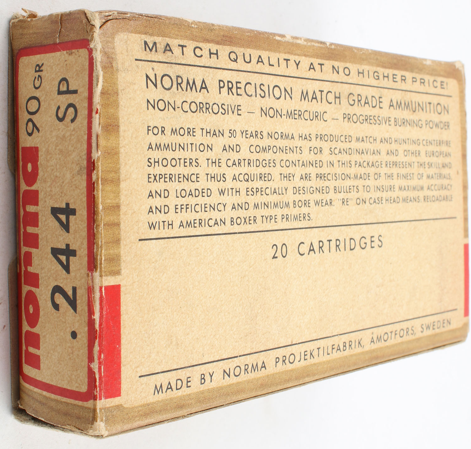 Norma, .244, Soft Point, 90 Grain, Full with 17rds. Being correct, 1pc. Multi-colored box, box is solid with very good color, has shelf wear, corner wear, ammo is very good. Grade: Good ++ - Value: 10 to 40