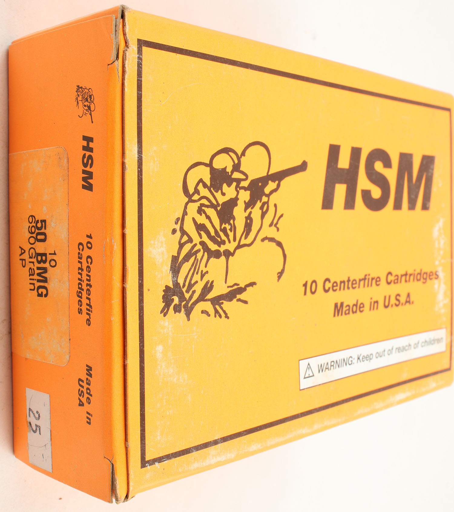 HSM, 50 BMG, 690 Grain AP, Full, 1pc., Orange and black box, box is very solid with excellent color, ammo is excellent. Grade: Excellent ++ - Value: 50 to 75