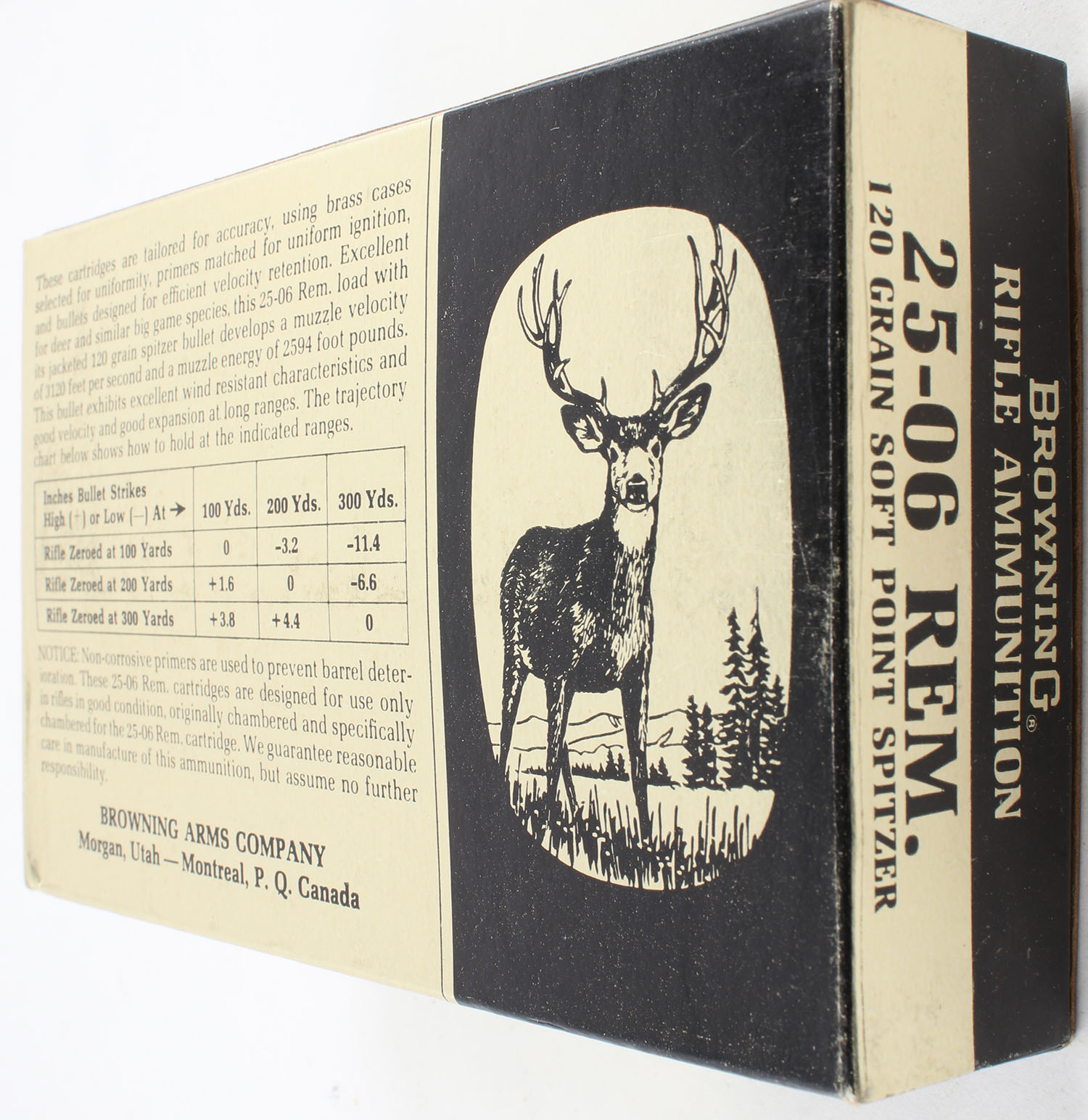 Browning, .25-06 Remington, 120 Grain Soft Point Spitzer, Full, 1pc. Multi-colored box, box is solid with excellent color, end flaps are solid, ammo is excellent. Grade: Excellent - Value: 20 to 40