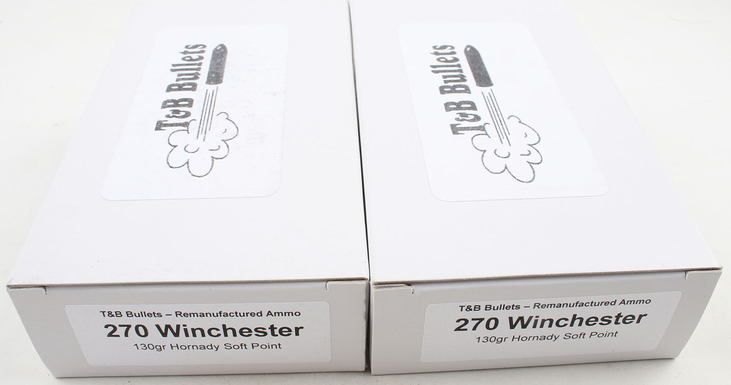 T&B Bullets, Lot of (2), .270 Winchester ammo boxes, Remanufactured Ammo by a class type 7 Ammo MFG (this is the same class (high quality) as Winchester, Federal and or CCI), 130 Grain Hornady soft point bullet, loaded cartridges, Full, 1pc, white boxes are very solid, ammo is minty. Grade: Excellent ++ - Value: 20 to 60