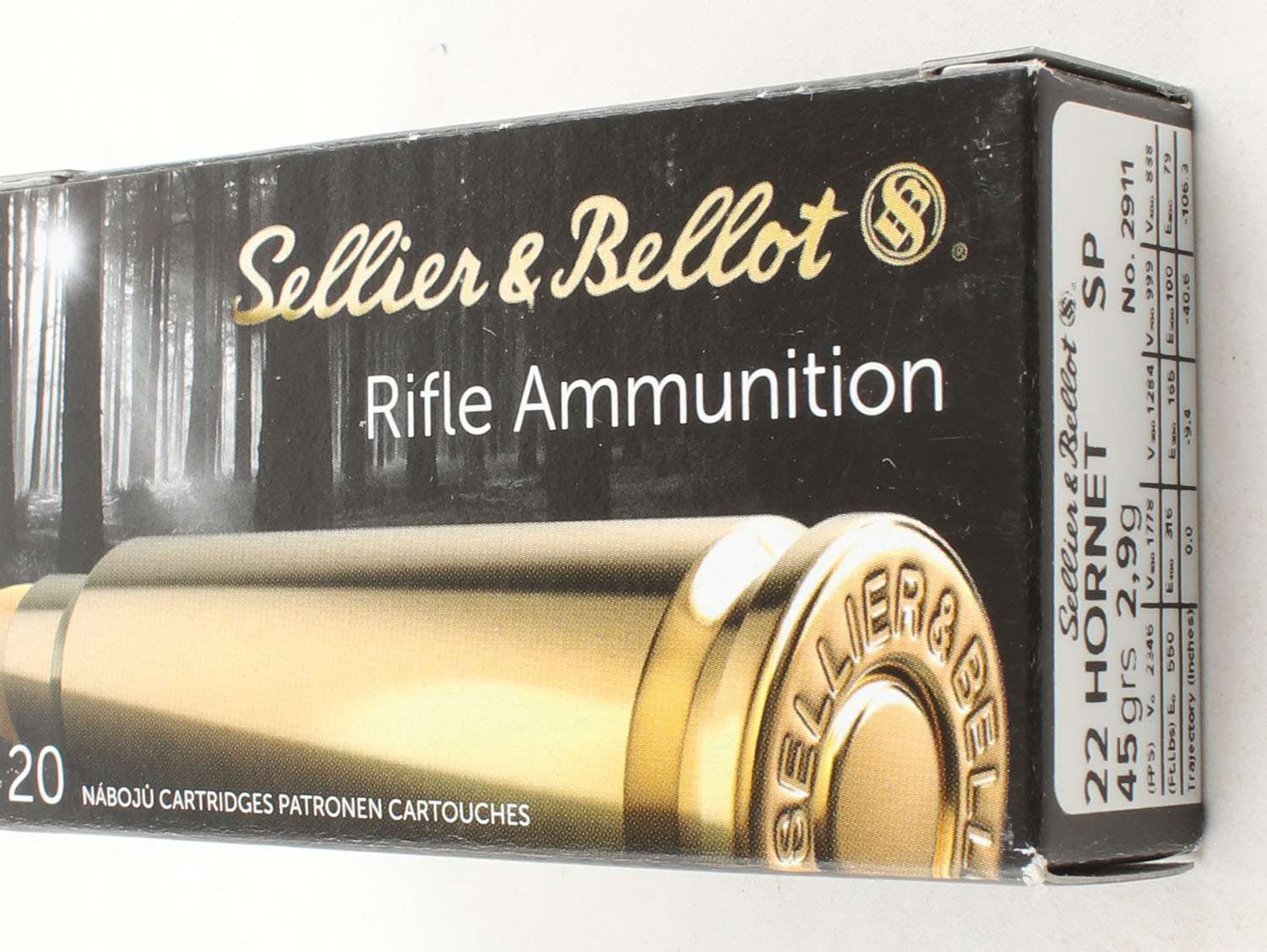 Sellier & Bellot, .22 Hornet, 45 Grain SP, Full, 1pc., multi-colored box, box is very solid, end flaps are solid, ammo is excellent, Grade: Excellent - Value: 20 to 50