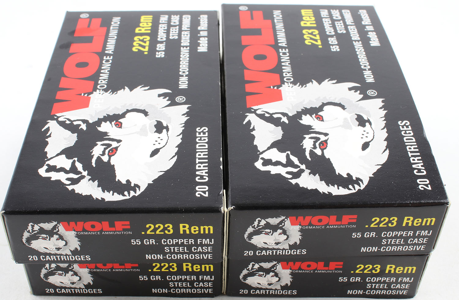 Wolf, Lot of (4), .223 Rem, 55 Grain Copper FMJ, Full, 1pc., Multi-colored boxes, boxes are very solid with excellent color, Ammo is excellent. Grade: MINT - Value: 24 to 36