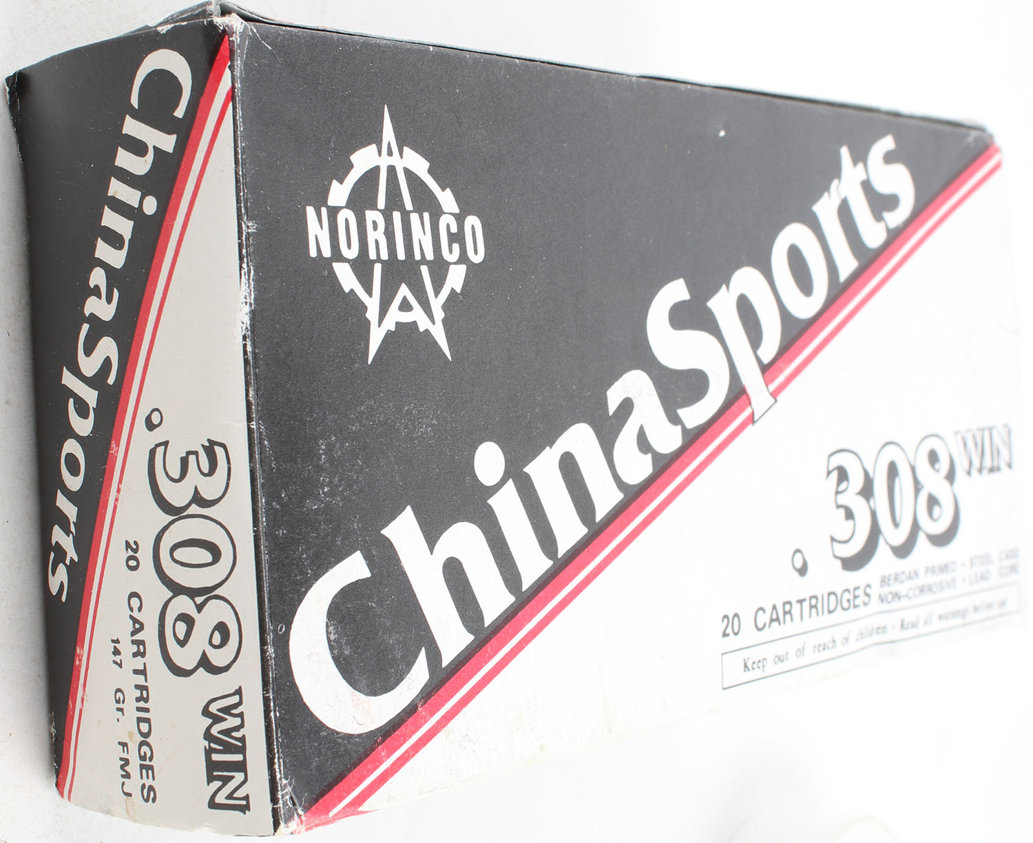 Norinco, .308 Win., 147 Grain FMJ, Ful, 1pc., Multi-colored box, box is solid with shelf wear, edge & corner wear, ammo is very good. Grade: Very Good ++ - Value: 10 to 20