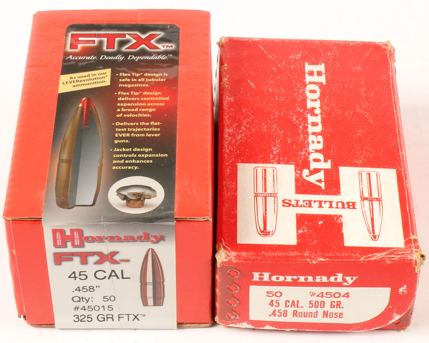 Hornady, Lot of (2), .45 Cal., 500 Grain Round Nose & 325 Grain FTX, Appear 2/3 Full, 1pc. Red boxes are very solid, bullets are excellent. Grade: Excellent - Value: 20 to 60