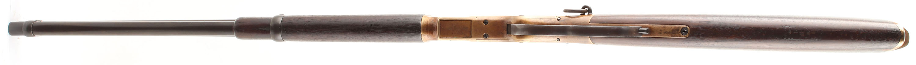Winchester, Model 1866 Saddle Ring Carbine, 3rd variation, .44 Henry Cal., MFG. 1870, SN: 32417, Lever Action Carbine, 20'' Round barrel, Full mag. The original wood stocks are excellent & solid, displaying a mix of original finish, added finish & some protective oils, all of which give it a wonderful aged & rich tone. There are very few handling marks & light contusions. The top edge on both sides of the forend tip have a spliced sliver of wood replaced to correct previous damage & to restore the edge. This was professionally done & feathered in to match the surrounding wood & finish. There is a tight hairline crack at the forend tip. The fit of the wood to metal is excellent. Overall, the stocks retain an excellent appearance. The metal has an even & rich deep chocolate brown patina. The brass receiver & buttplate are developing a very nice aged patina. Bore is very good, with some areas of cleaned roughness amongst strong rifling. The barrel carries the original flip-up rear sight, with 1,3 & 5 markings for 100, 300 & 500 YDS & a standard pinch blade barrel band front sight. The address atop the barrel is still sharp & very clear. Stock carries a brass flip-up trapdoor crescent buttplate, with a correct 3 piece cleaning rod held within. Staple mounted saddle ring. The SN is block stamped on the lower tang. Tight, smooth action & appears mechanically sound. This 1866 SRC has a great aged appearance & appears well maintained.* Antique, No FFL Req. - - Value: 7000 to 12000