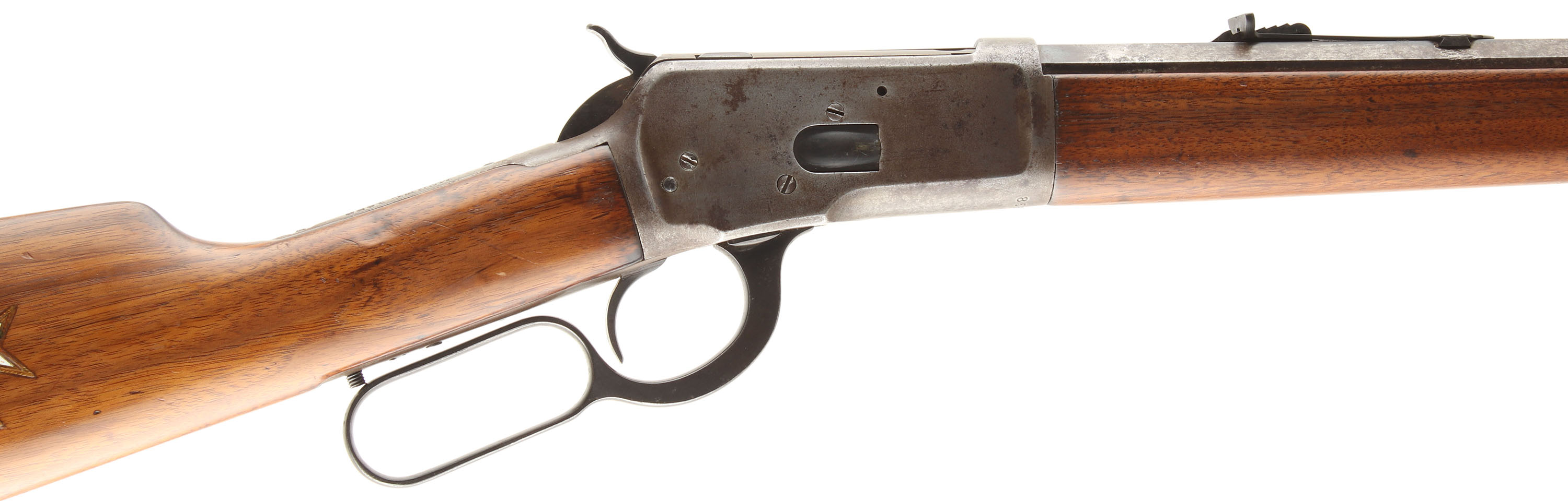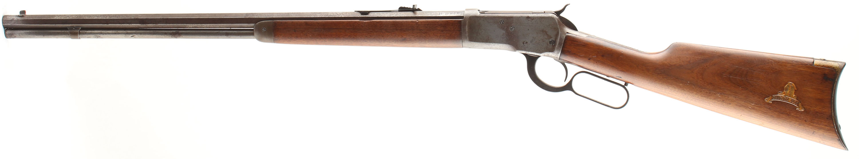 Winchester, Model 1892, marked 25-20 WCF, MFG: 1919, SN: 855378, Lever Action Rifle, 26 1/4'' Octagon barrel, Full mag. The original wood stocks are good & solid. The right side of stock exhibits an inlaid Maltese Cross metal with eagle pluribus shield, while the left side has an inlaid Chicago 1910 metal emblem. The stocks were sanded & refinished, likely at the time of the inlays, but still have remains of several minor scratches, scrapes & contusions. The metal finish has mostly worn to a gun metal gray, with a spotty thin brown patina & some areas of pitting or speckling. Bore is good, with cleaned roughness amongst solid rifling. The rifle is fitted with an adjustable rear sight & small blade front sight. The stock carries a smooth crescent metal buttplate. Tight smooth action. The rifle has lots of character & lots of shooting life left in the old rifle. FFL or C&R Req. - Value: 600 to 1000