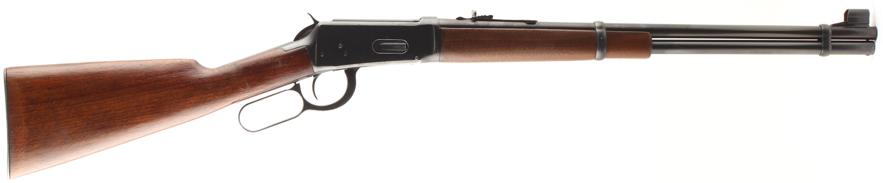 Winchester, Model 94 Carbine, CAL: 32 W.S., MFG: 1949, SN: 1592987, Lever Action Carbine, 20'' Round barrel, Full mag. The straight grip wood stocks are excellent & solid, with few minor handling marks to the original finish. The stock appears to carry an added layer of finish, which looks to have been needed after the stock was thinned some at the buttend to accommodate a narrower buttplate. The original metal blue finish rates 95% on the barre & mag tube, 90% on the receiver, with loss mainly located on the belly of the receiver. Bore is excellent & bright. The barrel holds an adjustable rear sight & hooded ramp front sight. Stock carries a checkered metal shotgun style buttplate. Smooth tight action. Overall excellent & mostly original carbine. FFL or C&R Req. - Value: 1000 to 1500