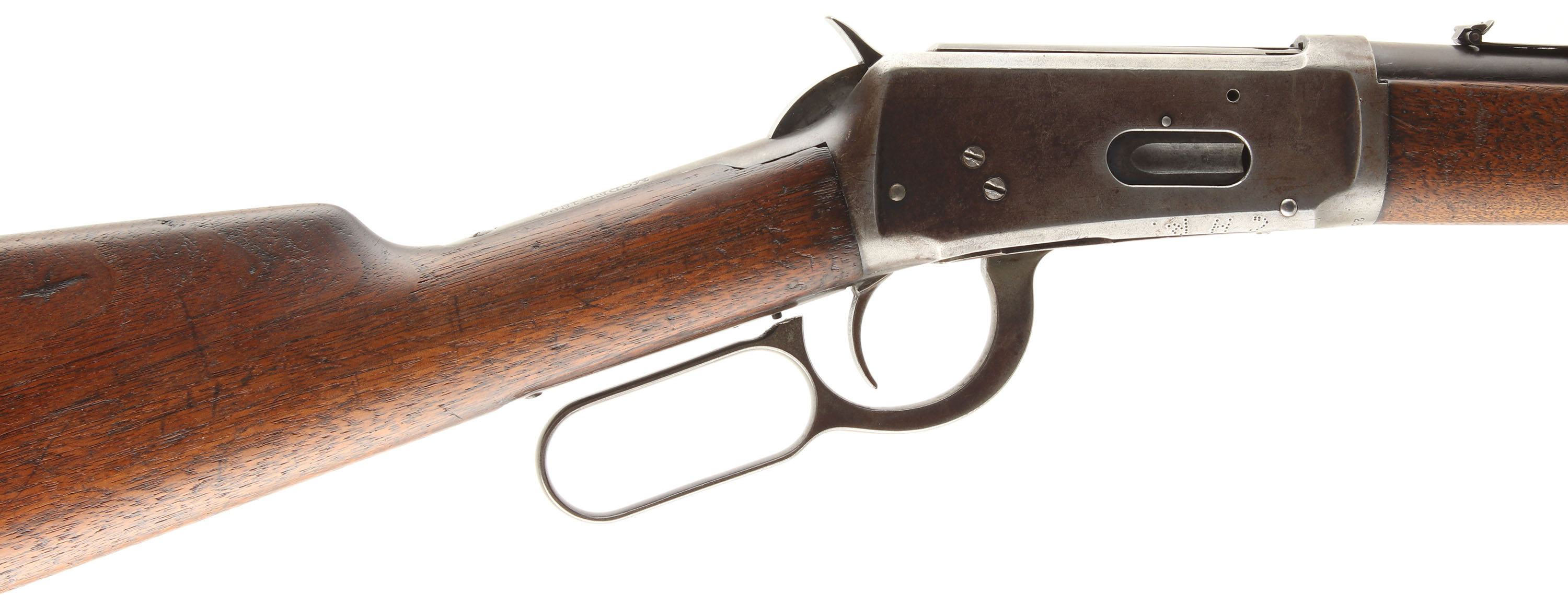 Winchester, Model 1894 SRC, CAL: 32-40, MFG: 1904, SN: 253423, Lever Action Carbine, 20'' Round barrel, Full mag. The straight grip wood stocks are very good & solid, with several tiny to minor scrapes, scratches & contusions to the stocks. The stocks appear to have been cleaned & possibly lightly sanded & refinished a long time ago, but have an authentic appearance. The original metal blue finish has worn mostly gun metal gray, with 20% remaining on the barrel, 30% on the mag tube & the receiver fully worn gun metal gray, with a very thin brown patina. There are three punch dot initial stamped into the right edge of the bell of the receiver. Bore is good, but with lots of cleaned roughness amongst strong rifling. There is also two rings in the barrel at 3.5'' & 5'' from the muzzle, but without too much visual evidence of bulges on the exterior. The barrel is fitted with a two leaf folding rear sight & carbine box front sight. Stock carries a smooth metal carbine buttplate. Saddle ring. Smooth tight action. A nice authentic appearance on this SRC shooter in the collectible 32-40 caliber. FFL or C&R Req. - Value: 500 to 1000