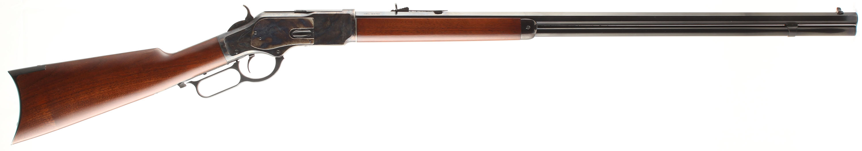 Uberti, Model 1873 Rifle, CAL: 44-40, MFG: Modern, SN: 55517, Lever Action Rifle, 30'' Octagon barrel, Full mag. The original straight grip wood stocks are excellent, displaying virtually no handling marks the excellent original finish. The high polished blue finish on the barrel & tube rates 99%, excellent. The receiver displays vivid case-colors. Bore is excellent, near mint. The barrel carries an adjustable rear & small blade front sight. Stock carries a crescent metal buttplate. A fantastic & basically new reproduction of an American classic. FFL Req. - Value: 1200 to 1800