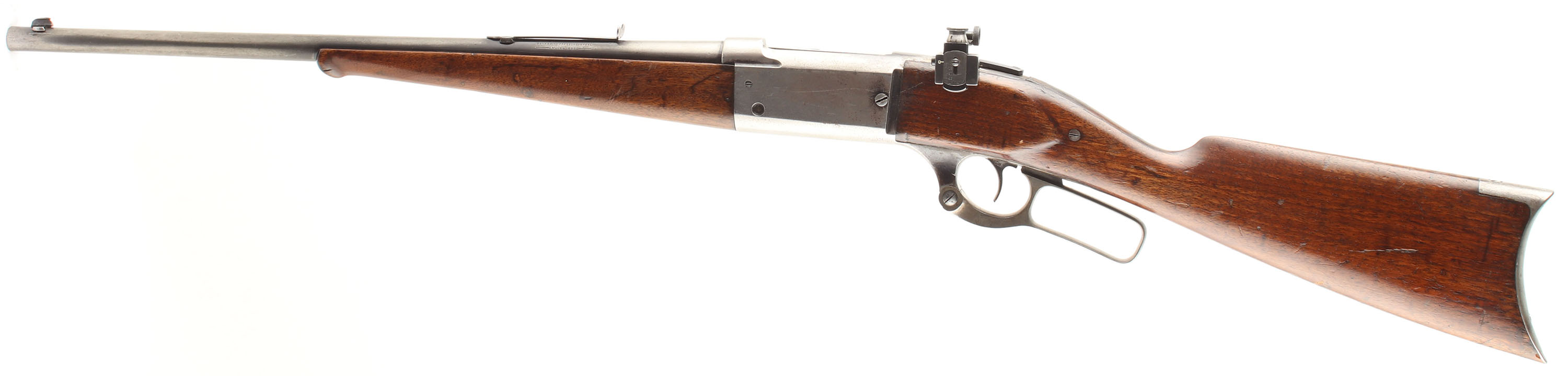 Savage, Model 1899, marked .303 Savage Cal., MFG. 1906, SN: 70024, Lever Action Rifle, 20'' Tapered round barrel, The factory straight grip wood stocks are good & solid, despite a 5'' stress crack emanating from the upper tang running back to the comb & two shorter stress cracks emanating from the tower tang. There is a screw on the left side of the wrist that has stabalized the stock at the wrist. Therewas also a break at the toe which currently has wood fill to maintain the toe shape. There are also numerous small to large scrapes, scratches & contusions & an added layer of finish over the remains of worn original finish. The metal surfaces have worn mostly gun metal gray, with some minor remnants of original blue in the most protected areas. The rifle is fitted with an adjustable Lyman 57AS side mounted receiver sight, while the barrel carries an adjustable rear sight , missing the elevator, & a Marble Sheard blade front sight. Bore is very good. The stock carries the original crescent metal buttplate. Likely a good shooter. FFL or C&R Req. - Value: 400 to 800
