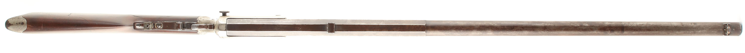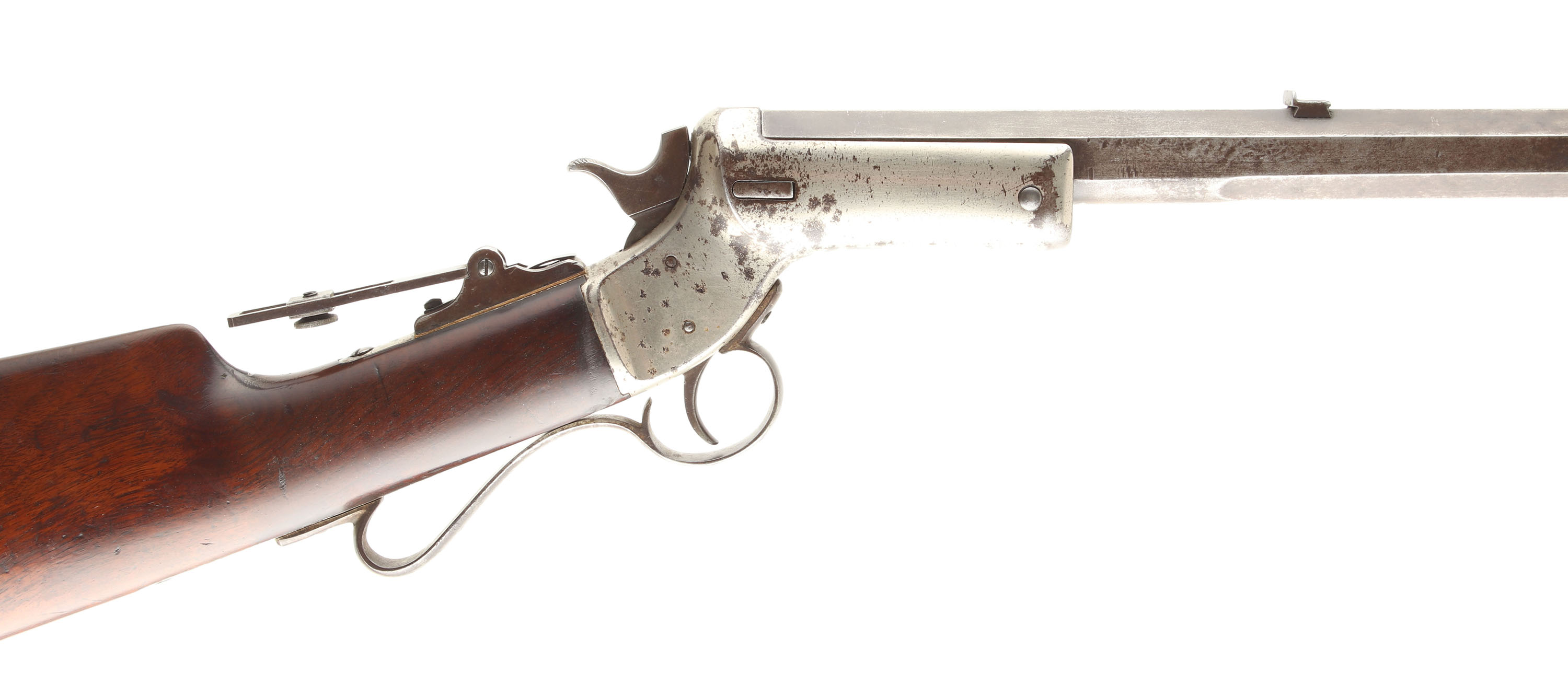 J. Stevens & Co., Model No. 4 Gallery Tip-Up Rifle, Cal: 22 RF, MFG: 1870's-88, SN: 214488, Single shot, tip open, 30'' Octagon to round barrel, The original straight grip wood stock is excellent, but with numerous minor to small scratches, scrapes & dings to the original finish. This model produced without a forend. Left side of barrel is marked ''J. STEVENS & CO. CHICOPEE FALLS.MASS. PAT.SEPT.6.1864''. The metal blue finish on the barrel has worn away & toned to a mix of gun metal gray & a thin brown patina. The nickel finish on the receiver is showing wear, with areas of loss developing a spotty brown patina. Scalloped trigger guard. The receiver is fitted with a large sliding disk flip-up Vernier tang sight, while the barrel carries a fixed rear & folding globe front sight. Bore is good, with areas of pitting & roughness amongst thinning rifling. Stock carries a crescent metal buttplate, retaining some original nickel. A very nice representative example of the early Stevens Gallery tip-up rifle, with factory special order sights. Antique, No FFL Req - Value: 600 to 1000