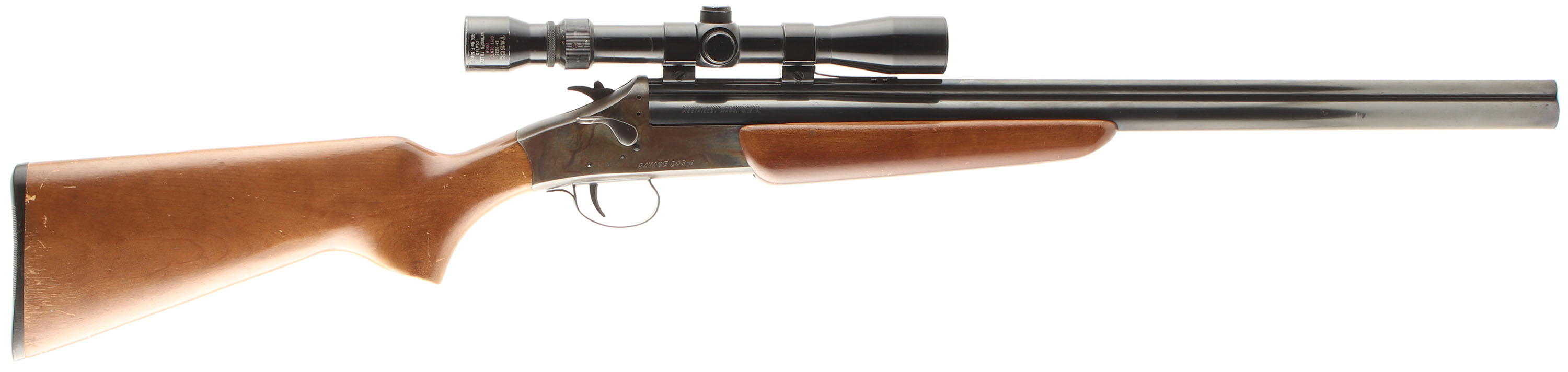 Savage, Model 24S-A Combo Rifle, CAL: .22 WIN MAG. RF/ 20 ga., MFG: 1964-67, SN: None, Break Action Single Shot Rifle/ shotgun comb, 2 3/4'' & 3'' shotgun chamber, 23 1/2'' barrels. The original flat pistol grip wood stocks are excellent, with numerous minor scrapes, scratches & light contusions to the original finish. The original metal blue finish rates 90% overall. The case-hardened receiver displays muted case-colors, Bores are excellent. The receiver carries a Tasco 3x-9x32 scope While the barrel carries the factory rear sight & no front sight. Stock carries the original black plastic buttplate, with a missing chunk at the toe. A popular & versatile combo firearm in one of the most sought after .22 Win Mag & 20 ga. combinations. Excellent overall condition. FFL or C&R Req. - Value: 450 to 750