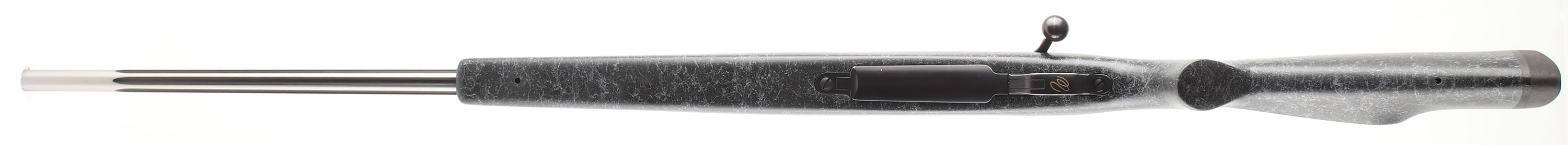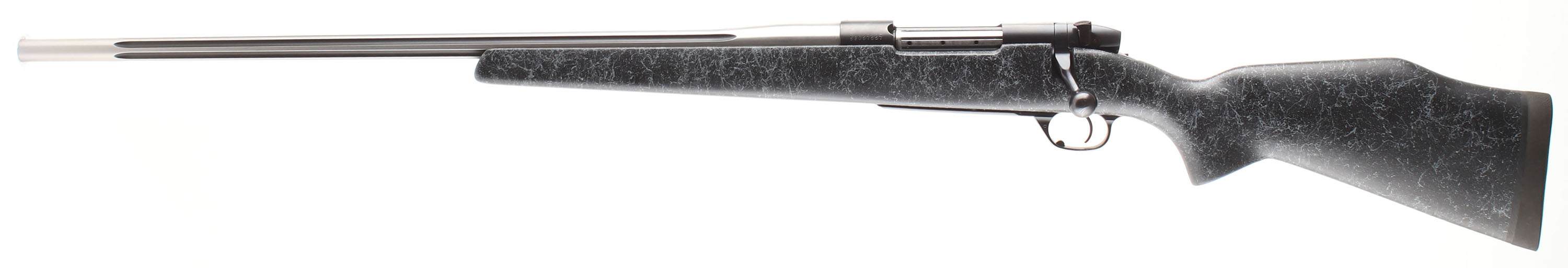 BOXED LEFT HANDED Weatherby, Mark V ACCUMARK, CAL: 300 Weatherby Magnum, MFG: 1995-2004, U.S.A., SN: SB057557, Bolt Action Rifle, 26'' Stainless fluted barrel. The original cheeked & pistol grip, hand-laid, raised Monte Carlo fiberglass stock, with matte gel coat & spiderweb accents is excellent. The 2-toned black & silver, Spun Stainless w/ Graphite Black Cerakote, fluted barrel is excellent both on exterior & bore. The factory metal blue finish rates 99% overall. The receiver has four open factory provisions for future scope mounting, with no open sight provisions on barrel. Stock carries a Decelerator solid recoil pad. Sling studs missing. Nearly new backstock inventory of gun store owner. Comes in the factory SN matching box, with paperwork. A high quality LEFT HANDED hunting rifle in overall excellent condition. FFL Req. - Value: 1500 to 2200