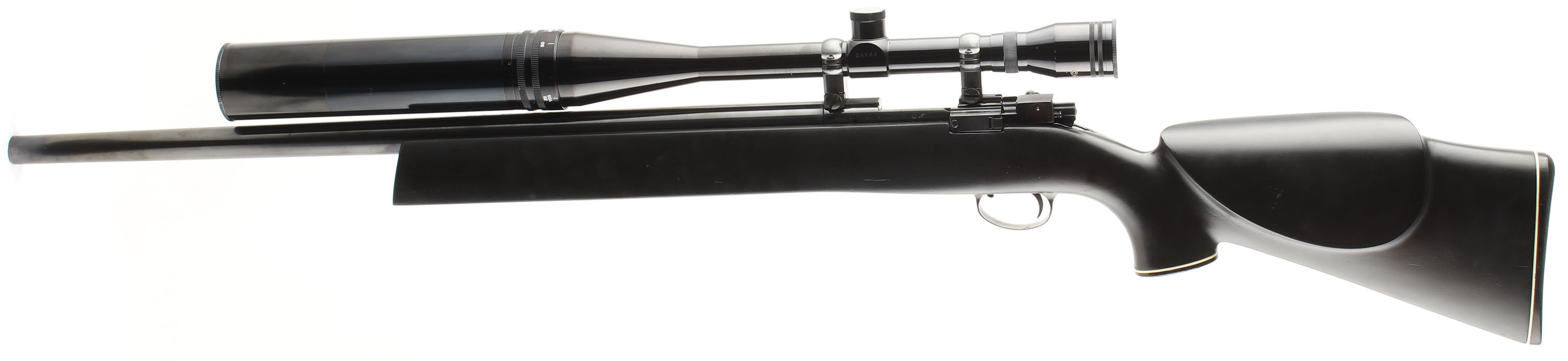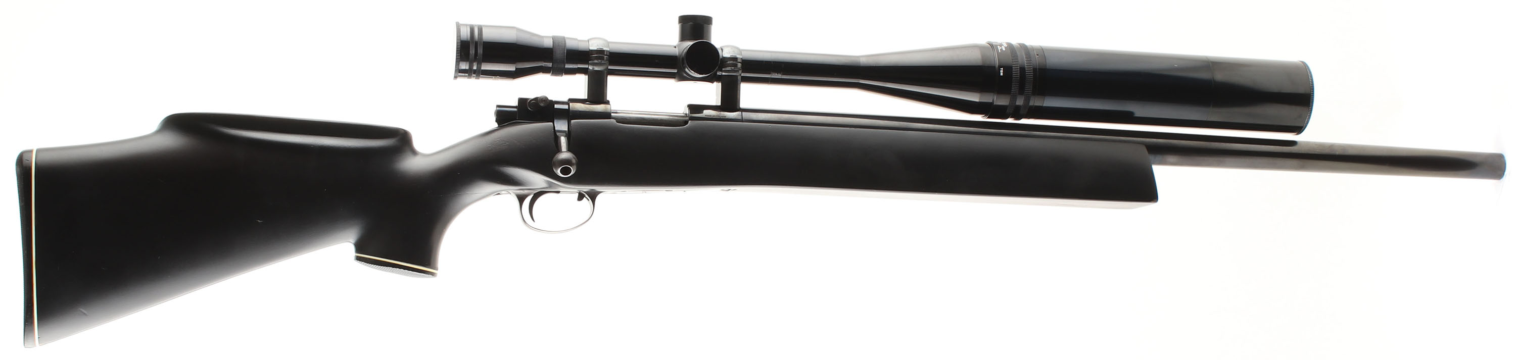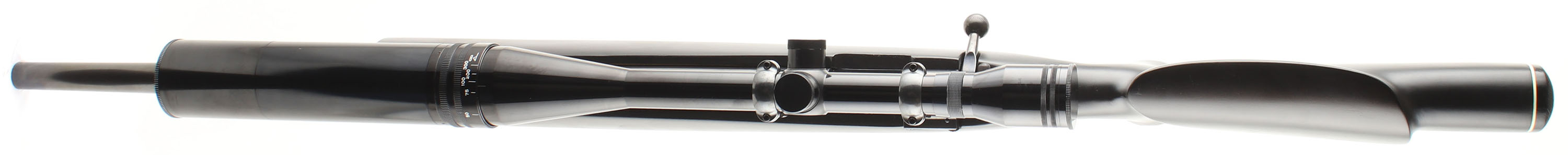 SN: 40832, Bolt Action Rifle, 24 1/4'' Round Bull Barrel. The cheeked & capped pistol grip wood stock is very good & solid, with a wide grip bench target style forend. The stock has a tight 2.5'' hairline crack emanating from the trigger guard back across the left side of the pistol grip & a few other minor rubs to the excellent black paint finish. The metal blue finish rates 90% on the barrel & receiver, while the finish on the trigger guard, mag & floorplate has worn thin & toned plum brown. Bore is excellent. Receiver mounted with a Tasco 24x44 scope, with sun shade & cap. The barrel has no open sight provisions. The stock carries a Herter's checkered black plastic buttplate. Caliber marked detachable mag. FFL or C&R Req. - Value: 500 to 800