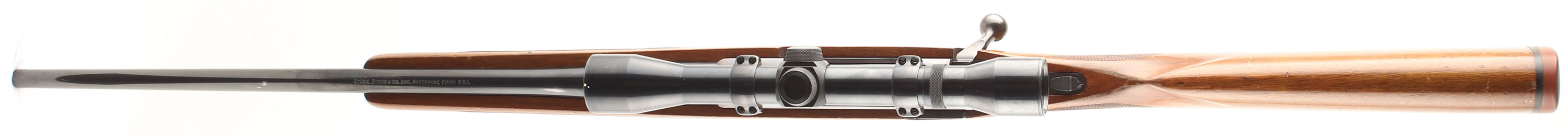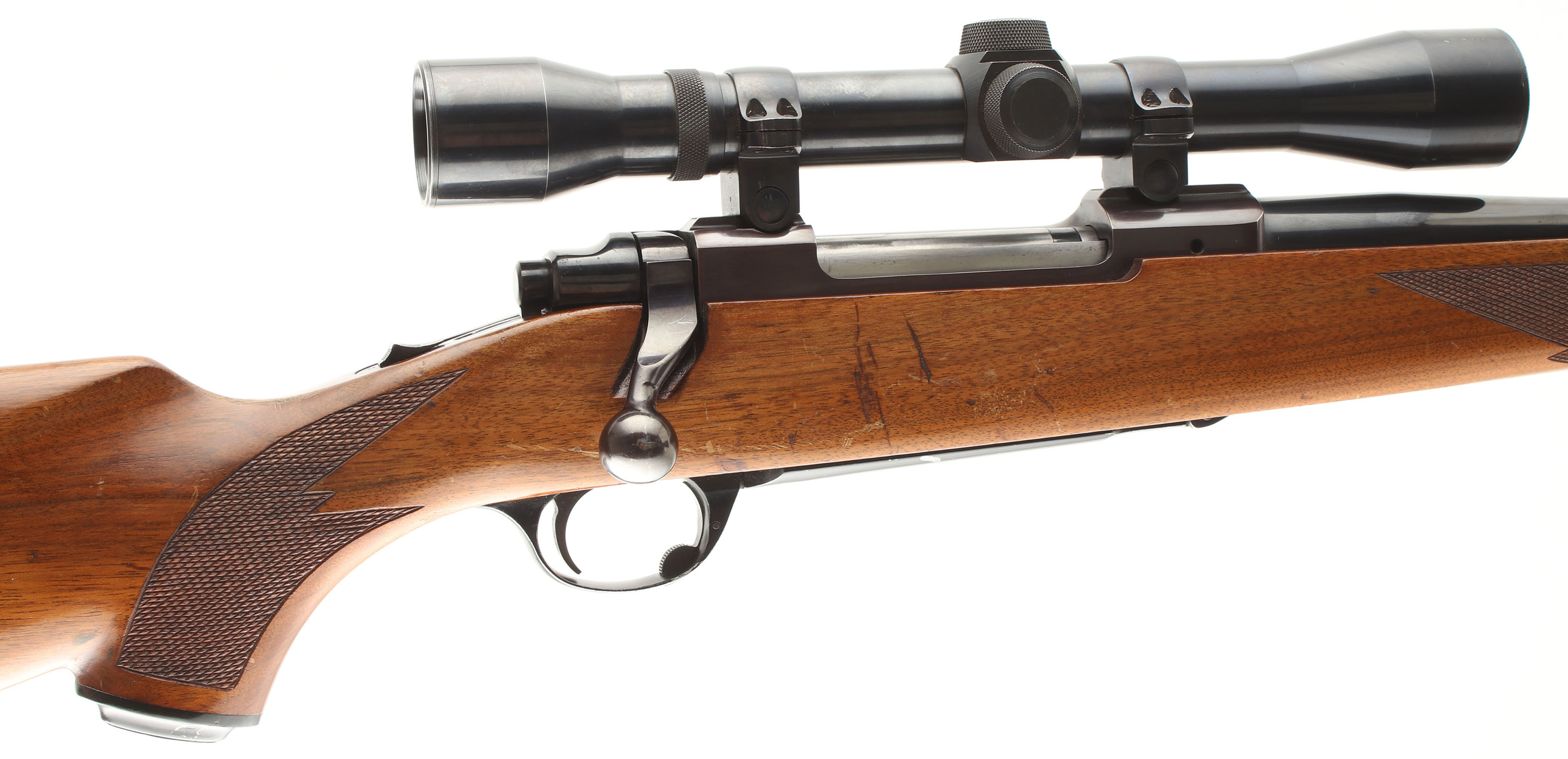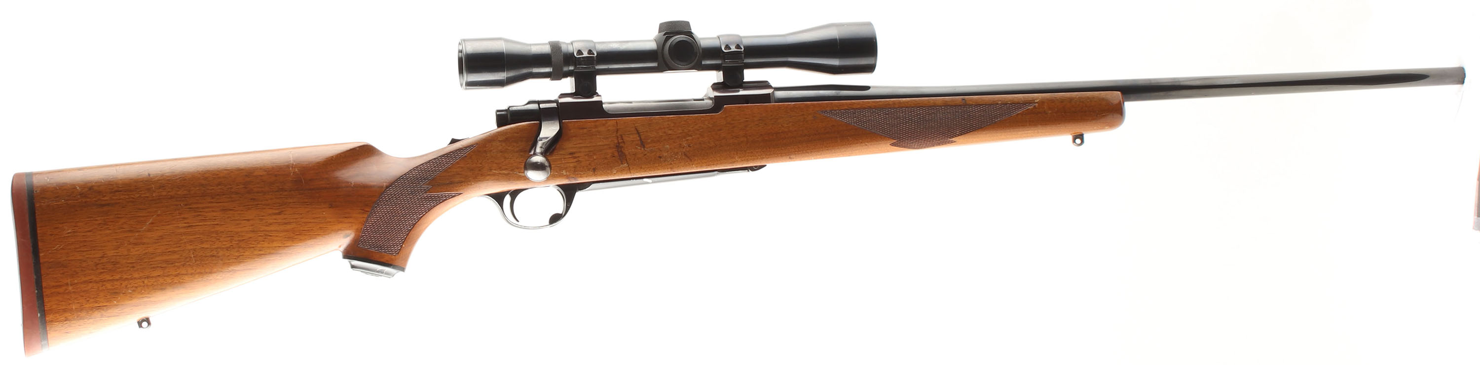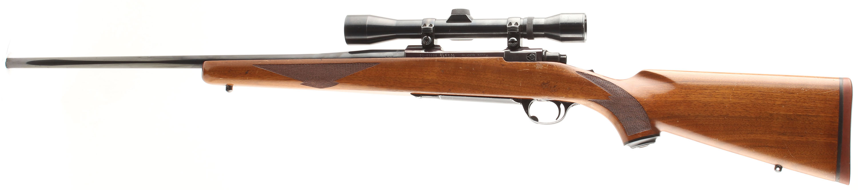 Ruger, Model M77, CAL: marked 7x57, MFG. 1975, SN: 71-63006, 22'' Round tapered barrel. The factory checkered & capped pistol grip wood stock is excellent, but with several minor to small scrapes, scratches, contusions & some flaking or thinning to the original finish. The original metal blue finish rates 90% on barrel & receiver, toned plum on receiver. Finish on the floorplate & trigger guard rates 80%. Small six digit # electro-penciled on left side of receiver next to SN. Bore is excellent. The receiver carries a period correct, unmarked scope on the integrated receiver rail, while the barrel has no open sight provisions. Stock carries a Ruger solid rubber recoil pad & sling studs. Solid & original. FFL or C&R Req. - Value: 600 to 900