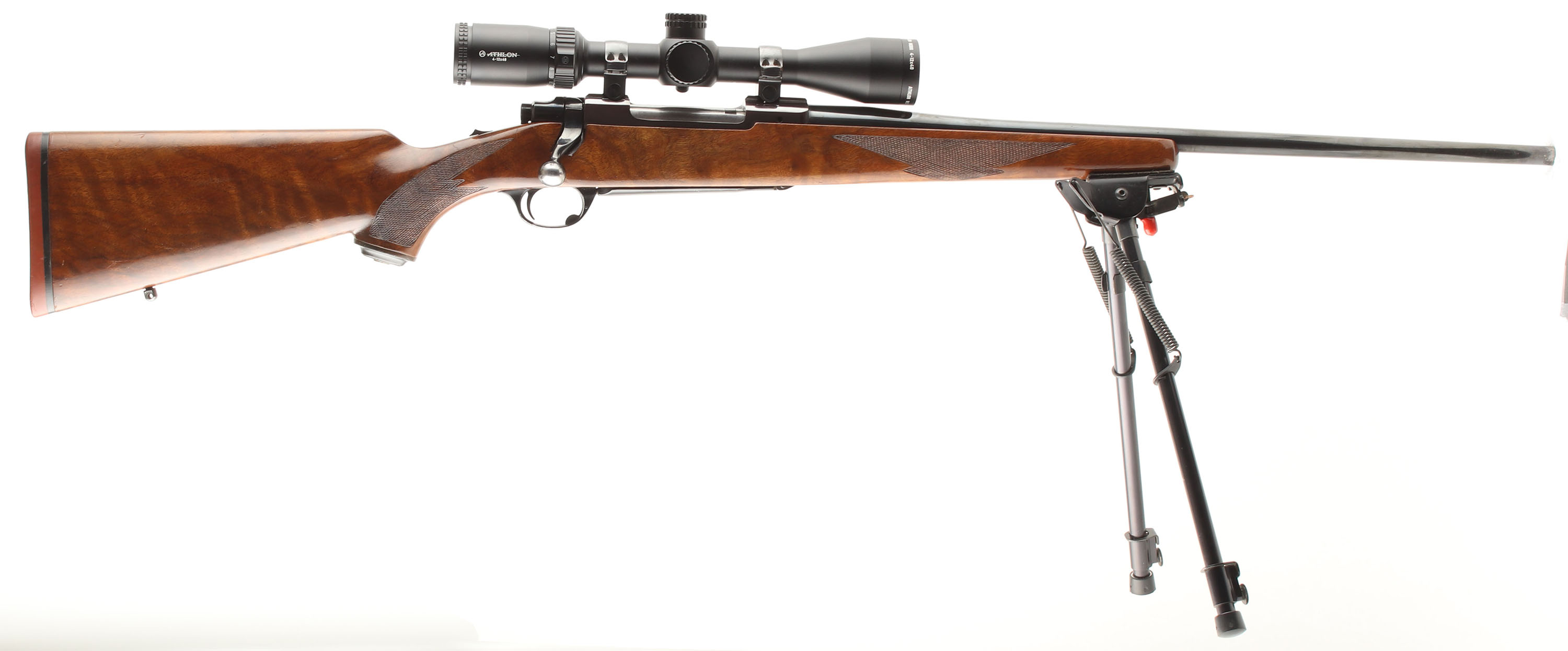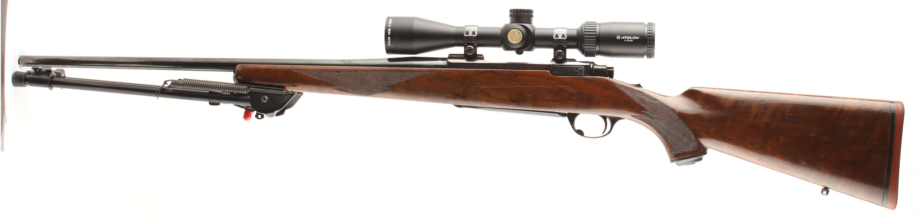 Ruger, Model M77, CAL: marked 270 WIN, MFG. 1981, SN: 75-85319, 22'' Round tapered barrel. The factory checkered & capped pistol grip wood stock is excellent, with several light scratches, minor contusions & rubs to the original finish, which is thinning from use, particularly around the pistol grip & forend. The pistol grip cap has an inlaid 270 cartridge case head. The original metal blue finish rates 80% on barrel, 90% on the receiver, toned plum, While the floorplate & trigger guard show additional wear & scratches. Bore is excellent. The receiver carries an Athlon 4-12x40 scope , while the barrel has no open sight provisions. Stock carries a Ruger solid rubber recoil pad & a forend mounted folding & adjusting bi-pod. Sling studs. Previous owner used this as a target & bench hunting rifle. FFL Req. - Value: 500 to 800