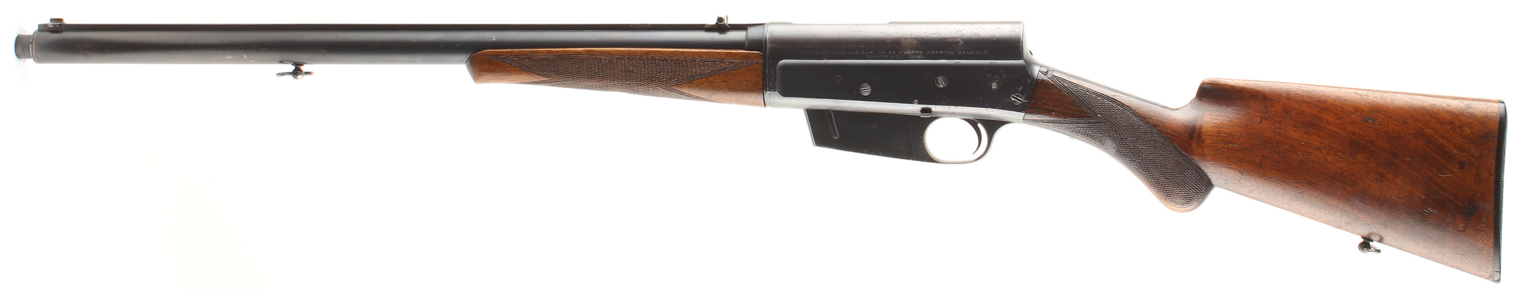 RARE FN (Fabrique Nationale), Model 1900, .35 Rem Cal., MFG. 1910-36, SN: 121, Semi-Auto Rifle, 22'' barrel, In Belgium it was known as ''La Carabine Automatique Browning'', in Germany it was the ''Selbstladebchse Browning Kaliber 9mm'', but in the U.S. we know it simply as the F.N. 1900. Records indicate only 4,913 Modele 1900's were ever produced. While records indicate 2909 rifles were produced for the years 1910-21, with no allocation to a particular year during that time, it is very likely that SN 121 is a first year production rifle. This rifle, invented by John Browning, was one of Europe's first successful semi auto high-power rifle. FN obtained the rights to produce the rifle as early as 1902, however, they chose to focus their production efforts on the A5 shotgun, which they acquired production rights to at the same time. They correctly viewed greater consumer sales potential in the A5. By 1904 restrictive importation tariffs into the U.S. caused Browning to negotiate with FN to allow manufacture of his shotgun within the U.S. The Remington Arms Co. was eager to work with John Browning & acquire the rights to manufacture both his autoloading shotgun & his autoloading rifle. FN was first to introduce the long-recoil shotgun (A5), but it was Remington that first produced John Browning's long-recoil rifle in 1906, dubbed the ''Autoloading Rifle'' or more commonly known today as the Model 8. If the Remington Model 8 is the grandfather of American semi-automatic sporting rifles, the F.N. 1900 is its European twin. The FN model 1900 was marketed throughout the world except the U.S., while the model 8 was intended for the U.S. market. Production comparisons place the model 8 at around 70,000, nearly a 14 to 1 difference in total FN production. Since the FN was not sold in the U.S. market, few examples of the limited 4913 total produced are found amongst collectors in the U.S. It is known that some were vet bring-backs from two World Wars & at least a few were imported by John & his son Val Browning into the US. Since the FN was exported to Canada, some have made their way south of the border. Regardless of how they arrived, they are rare & very desired amongst John Browning, FN & Remington 8 & 81 collectors. Produced with old-world craftsmanship, these rifles are a testament to Fabrique Nationales world-wide reputation for manufacturing high quality firearms. It doesn't take long to notice there were probably more hours of labor involved in producing the FN over the Remington. A close inspection & disassembly of both rifles will reveal a significantly superior fit & finish with the Belgium made version, even over early production Model 8's. The FN came in two versions, neither of which were a higher grade than the other. One version had a standard barrel jacket like the Model 8, the other a solid barrel rib running the length of the jacket, which is the case with this example. These take-down rifles were often broken down into the 22'' & 20'' halves & placed into travel cases for train rides into the countryside for hunting. The rifle has an English walnut round knob pistol grip stock & schnabel tip forend. Hand cut factory checkering is 20 lines-per-inch, with the early 1st style 6 point forearm checkering pattern. All hand fit & assembled, to that point stocks do not always interchange one rifle to another & factory LOP can vary by as much as a full inch. LOP on this rifle is 13 7/8''. The stocks original condition is very good, with honest use wear & some thinning to the original finish. The finish has darkened a bit in areas of the stock, with some smoothing to the points of the hand cut checkering. There are also minor to small handling scuffs, scratches & contusions. The barrel carries a solid matted rib, which carries the front & rear sights. The rear sight is the original two position flip sight, but it has been moved rearward towards the receiver approximately 2'' & a blank fills the original dovetail. The original metal blue finish rates 85% on the barrel, 75% on the receiver, with blue thinning most on the magazine. There is spotting & some cleaned light pitting or abrasions mostly found on the left side of receiver & mag. There is also a dent on the bottom of the magazine, along with some abrasions. The left side of the receiver carries the factory roll stamp & proof markings. Matching SN's on the receiver, barrel, side of lower tang, bottom channel of stock & inside of forend. Bore is excellent & bright. The stock carries the early FN serrated buttplate, with some minor edge chipping. Factory sling loops. Tight action & all appears to function as it should. Overall, the rifle has a very nice vintage & original appearance, which is highly collectible as a rare & early 1st year production rifle. FFL or C&R Req. - Value: 3000 to 4500