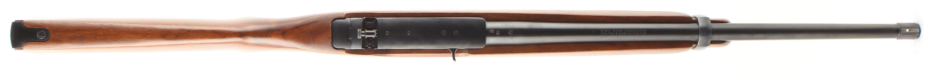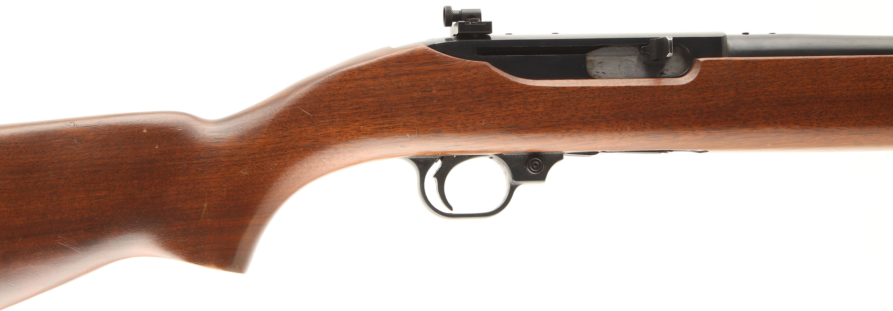 Ruger, Model 44 Carbine, CAL: 44 MAG, MFG: 1964. SN: 90152, Semi Auto Rifle, 18 1/4'' Barrel. The factory wood stock is in very good, near excellent, condition. The stock is solid with light handling wear & some, scratches, and dings. The blued finish on the barrel and frame rates 97% with some splotches of patina and exposed gun metal grey. Bore is excellent, bright with strong rifling. Mechanically solid, seems to function well. The top of the frame holds a windage & elevation adjustable rear peep sight. A fixed front sight with a white plastic insert is set in a dovetail cut on the end of the barrel near the muzzle. FFL or C&R Req. - Value: 700 to 1400